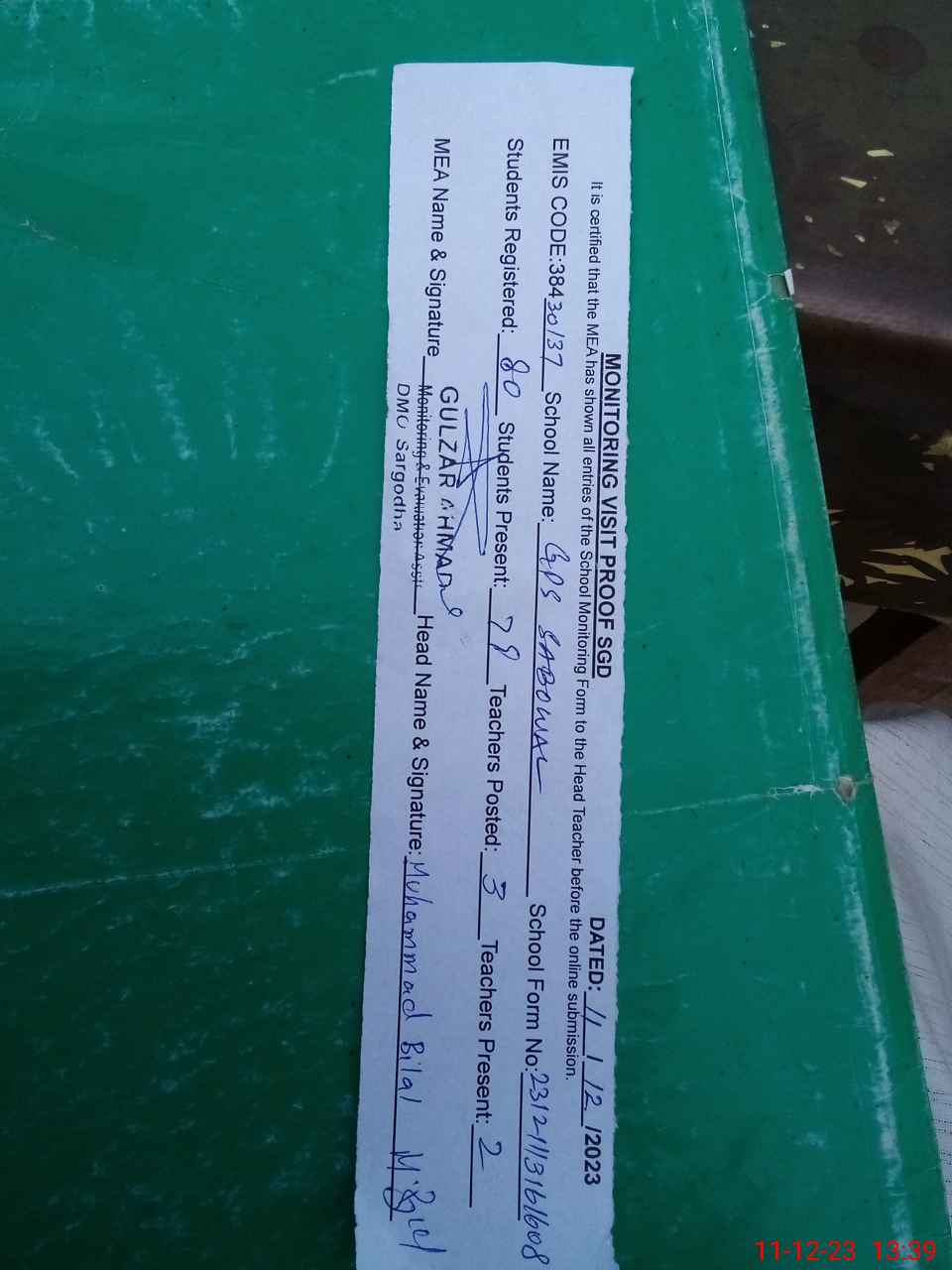 | Attendance Register | Head Teacher | MEA with School | Visit Proof |