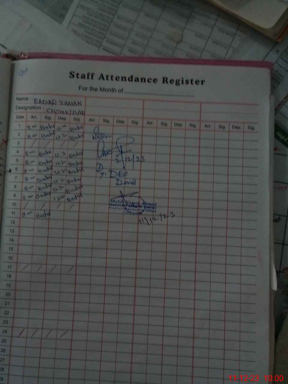 | CNIC | Full Name | Designation | R/C | Absence during last cal. month |