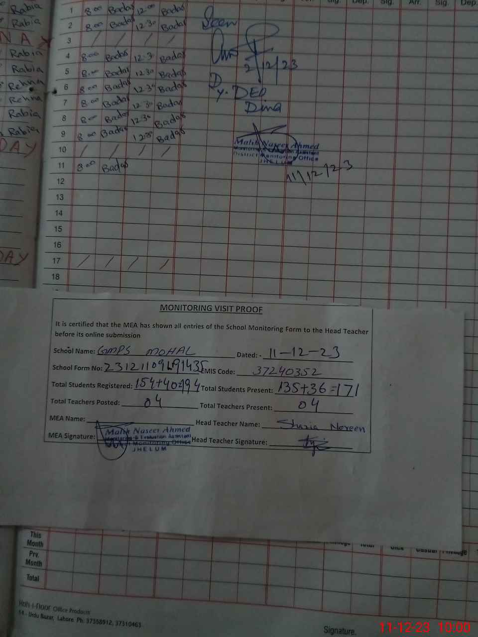 | EMIS Code: 37240352 | Name of School: GMPS MOHAL | |||
