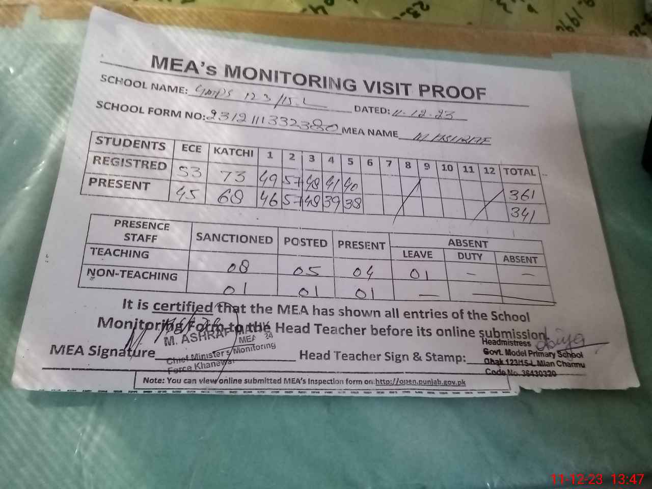 | Attendance Register | Head Teacher | MEA with School | Visit Proof |