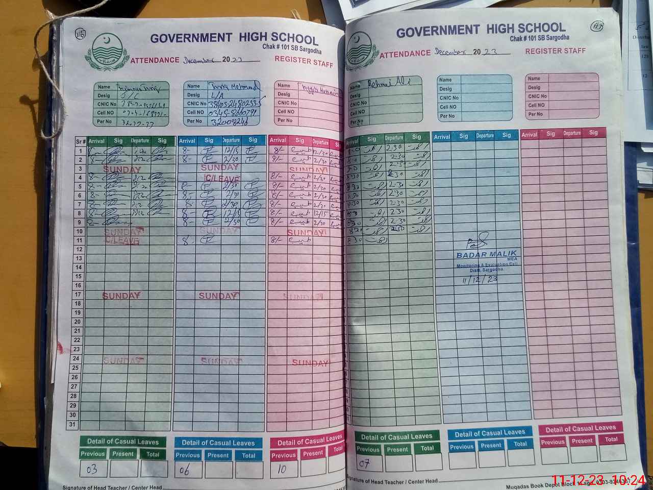 | CNIC | Full Name | Designation | R/C | Absence During Last Calender Month |