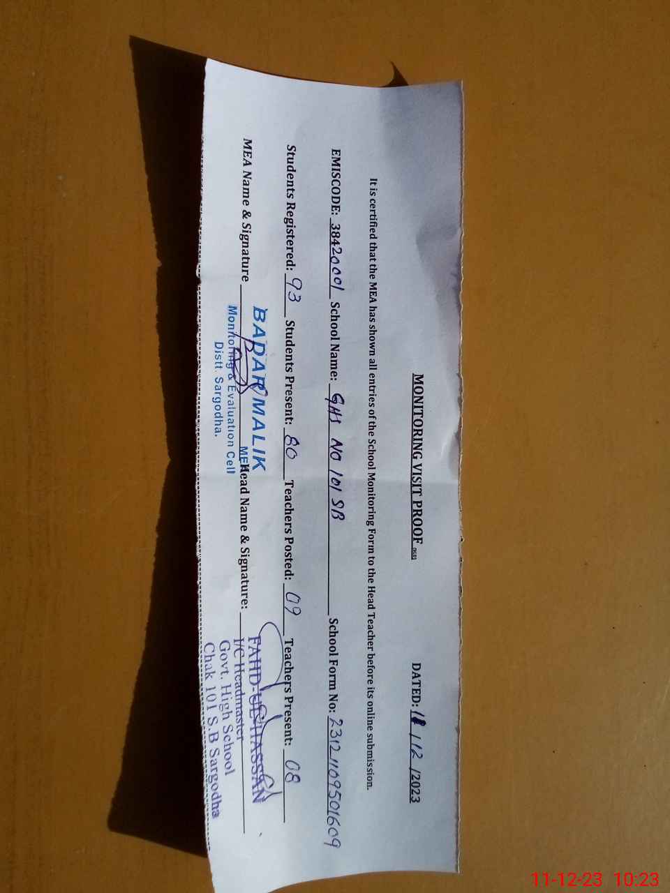 | Attendance Register | Head Teacher | MEA with School | Visit Proof |