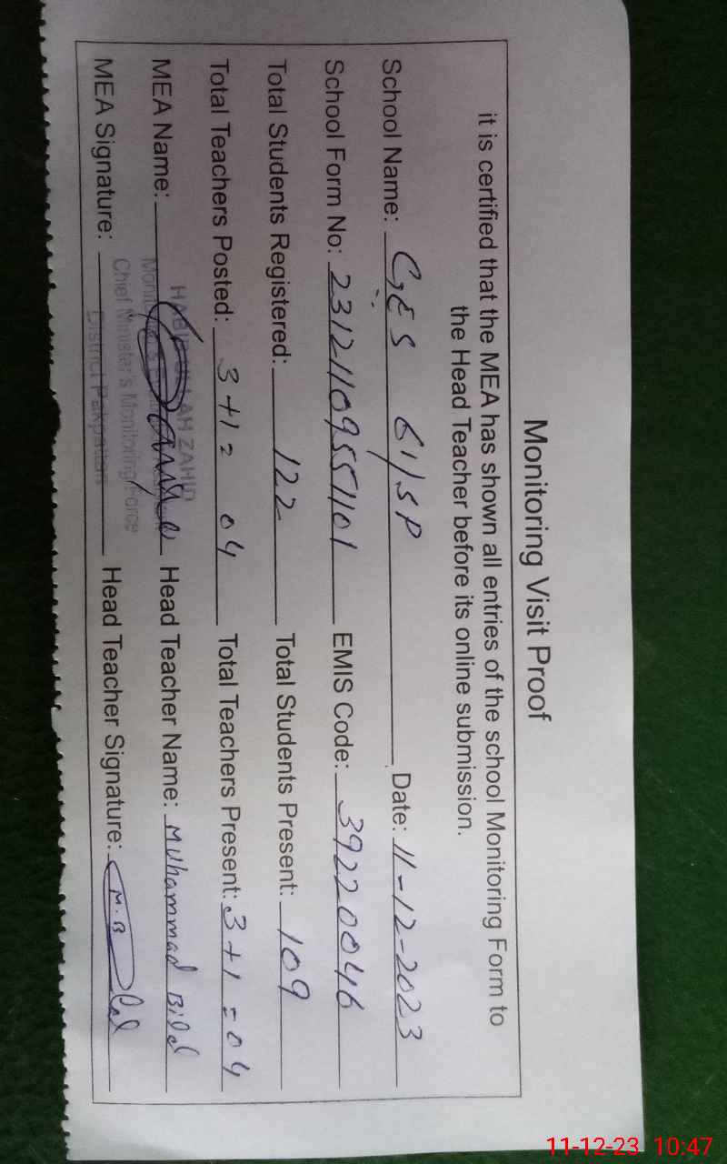 | EMIS Code: 39220046 | Name of School: GES CHAK NO. 61 / SP | |||