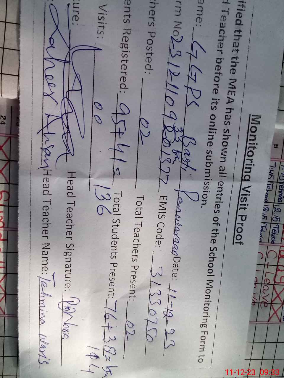 | Attendance Register | Head Teacher | MEA with School | Visit Proof |