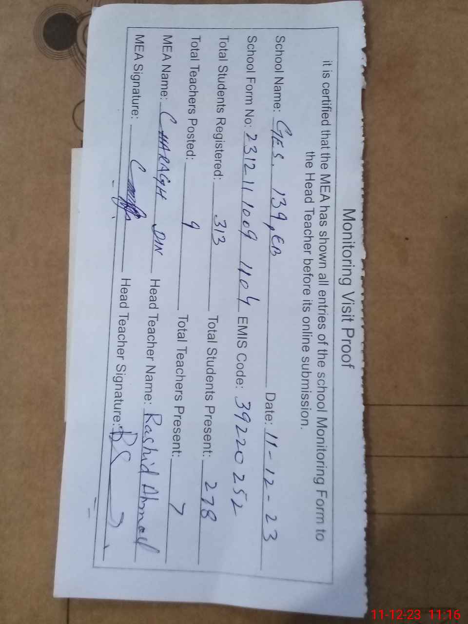 | EMIS Code: 39220252 | Name of School: GES CHAK NO 139 EB | |||