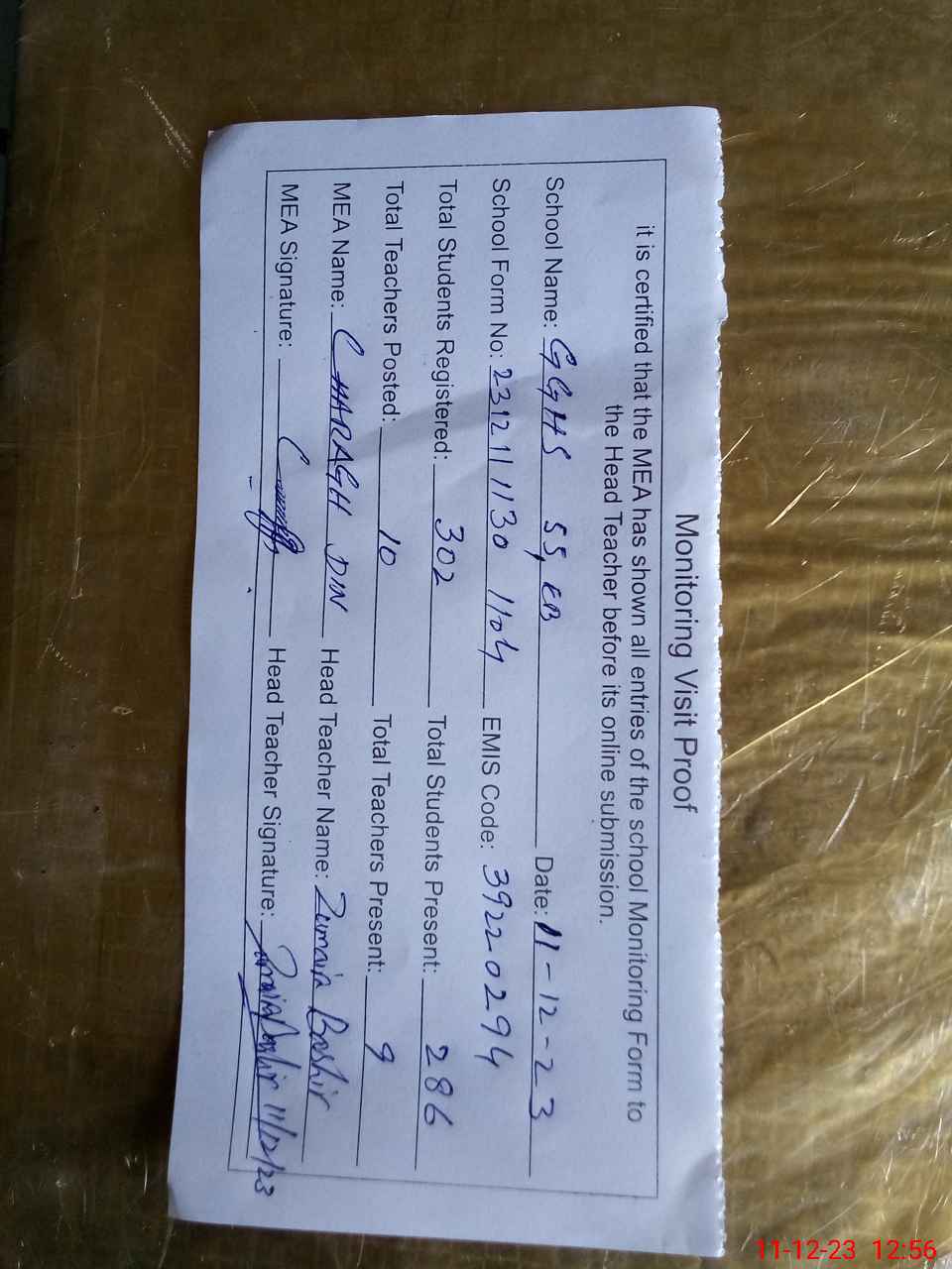 | Attendance Register | Head Teacher | MEA with School | Visit Proof |