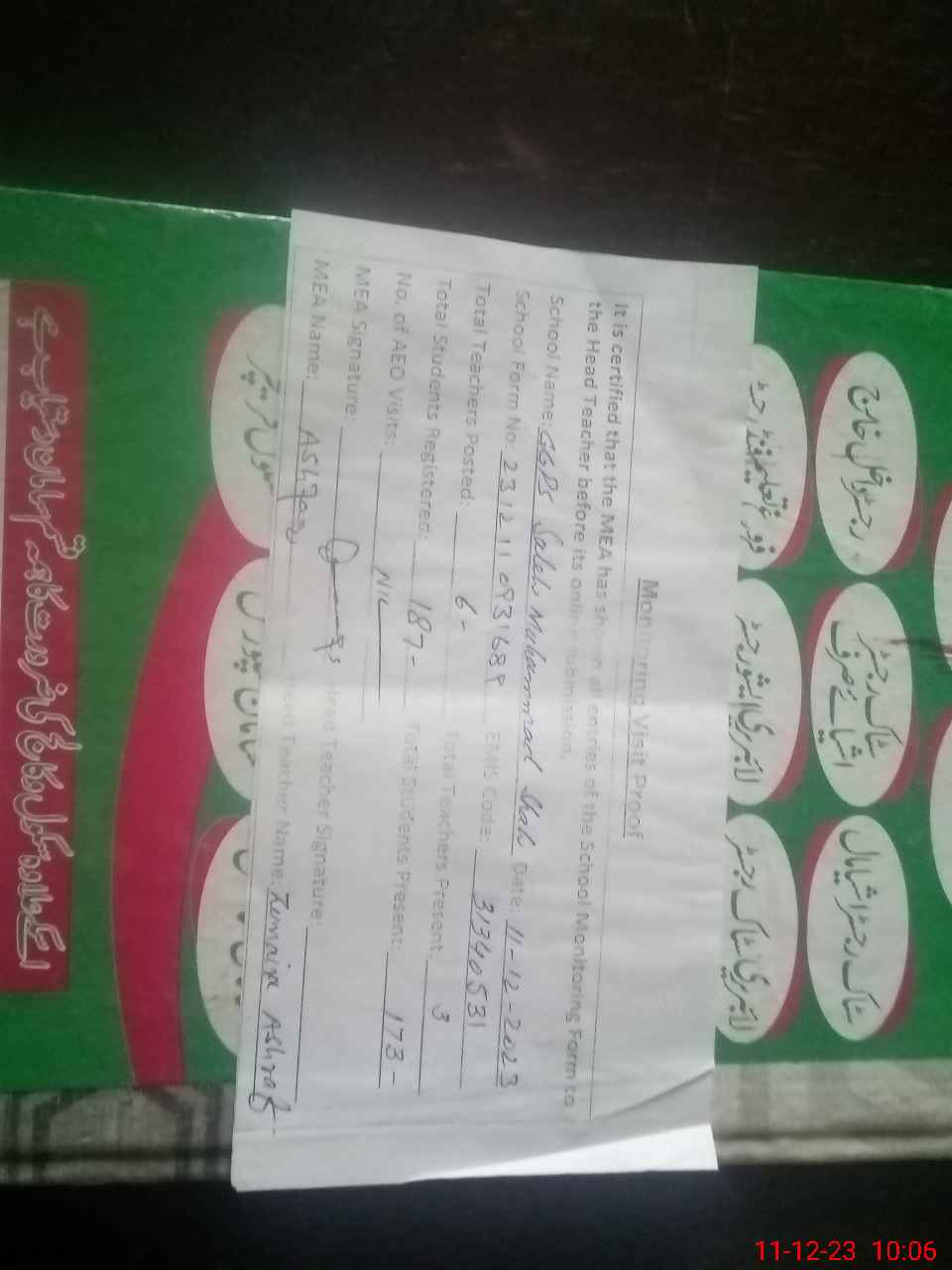 | Certified that this School was Inspected by the Undersigned MEA/DMO Today and the Information Stated Above is as Per Record. | |||||