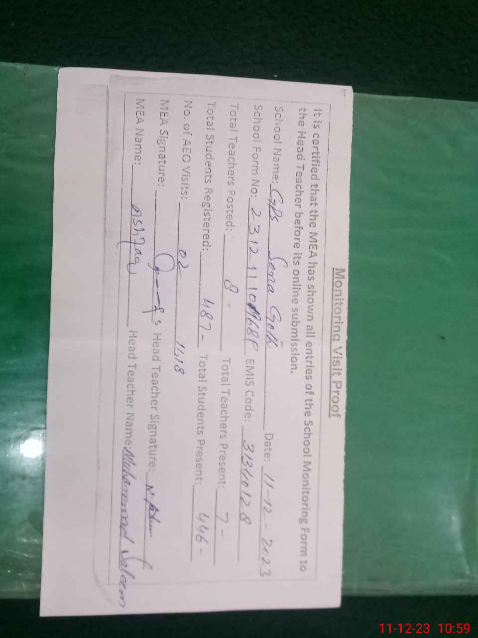 | Attendance Register | Head Teacher | MEA with School | Visit Proof |