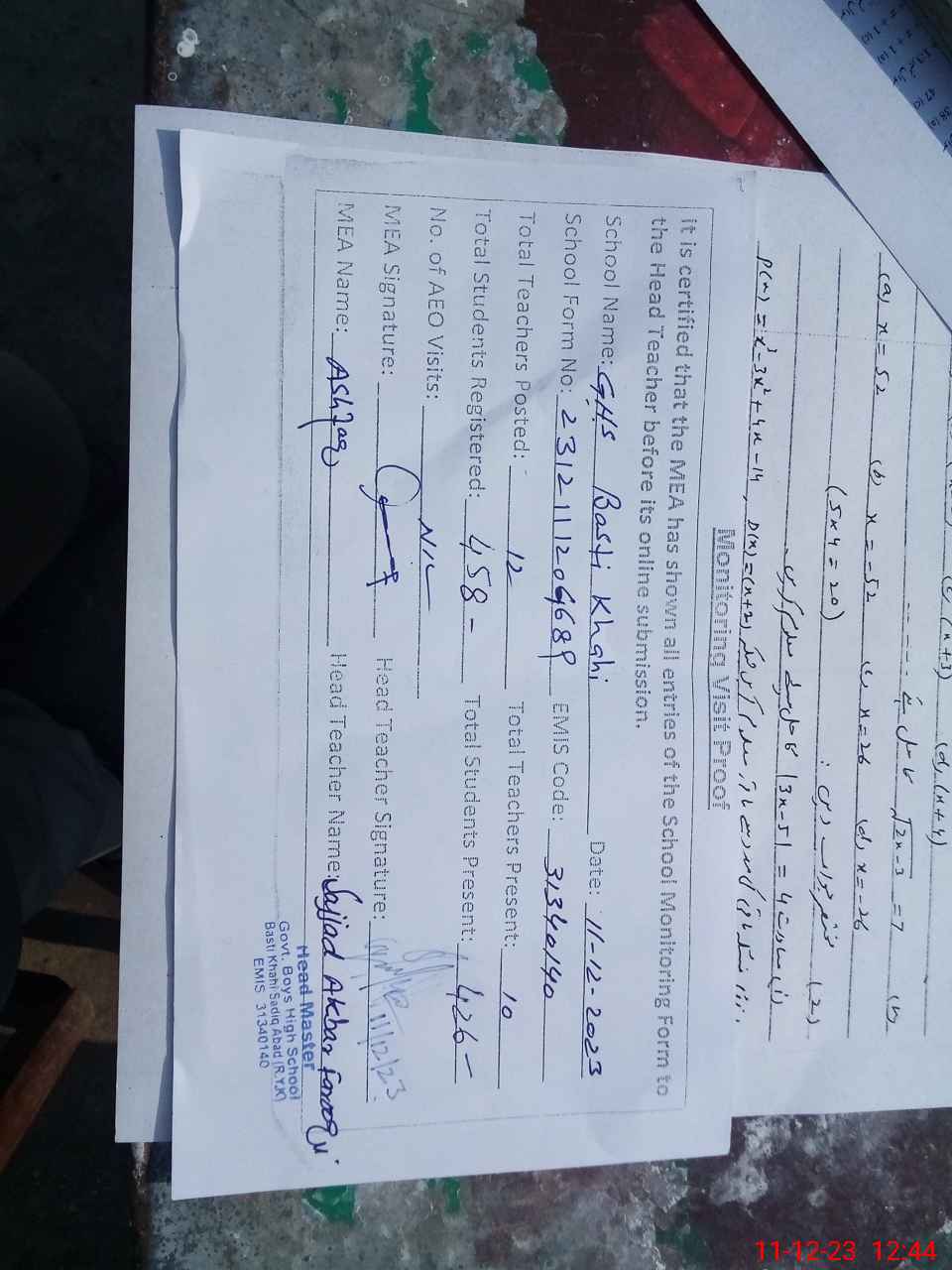 | Certified that this School was Inspected by the Undersigned MEA/DMO Today and the Information Stated Above is as Per Record. | |||||