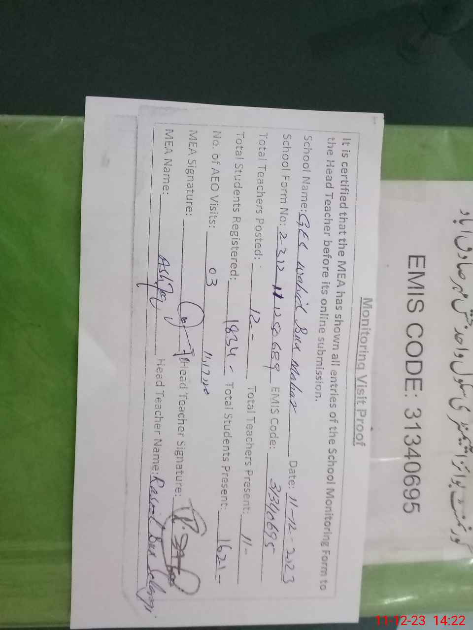 | Attendance Register | Head Teacher | MEA with School | Visit Proof |
