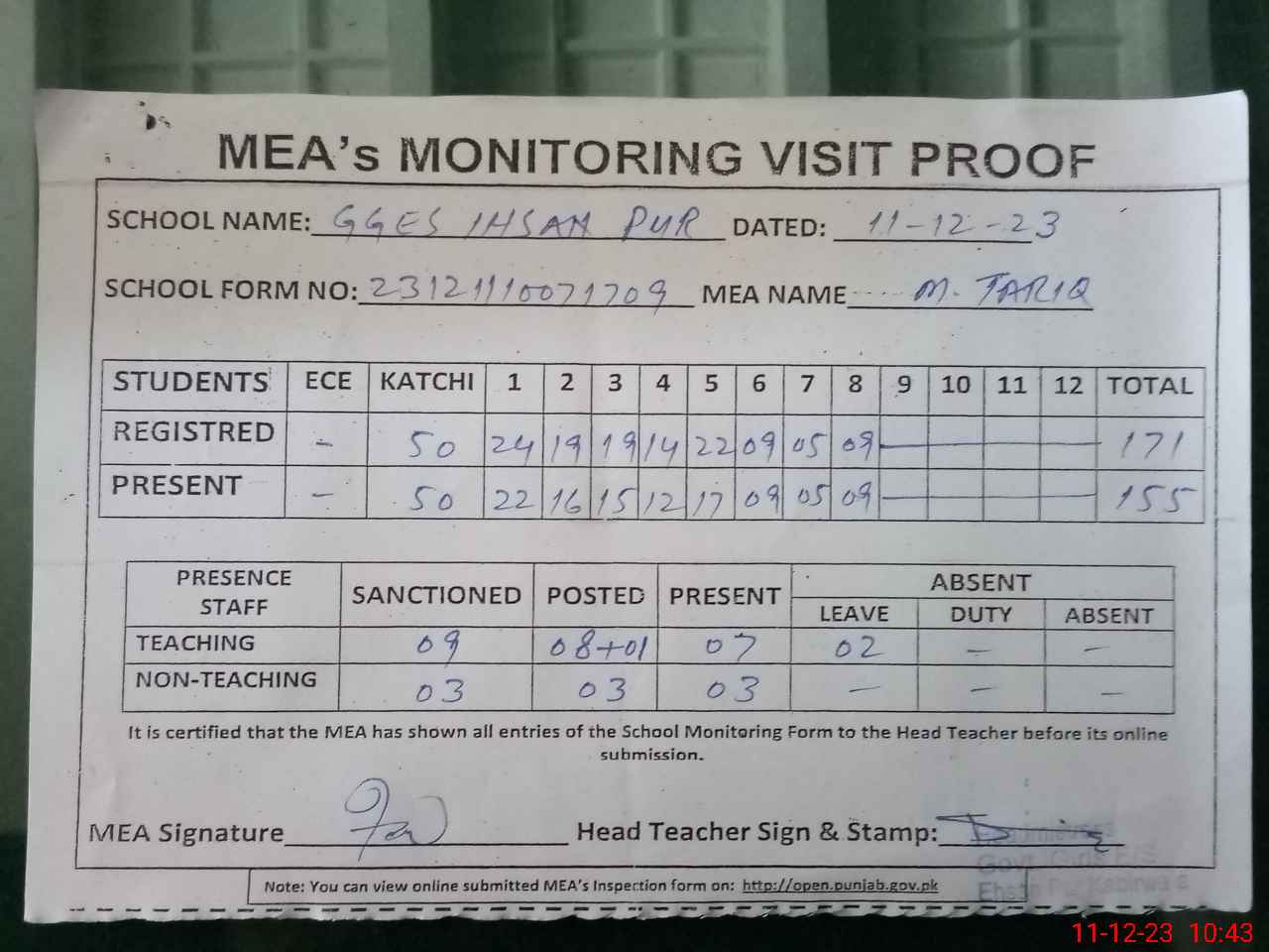 | Attendance Register | Head Teacher | MEA with School | Visit Proof |