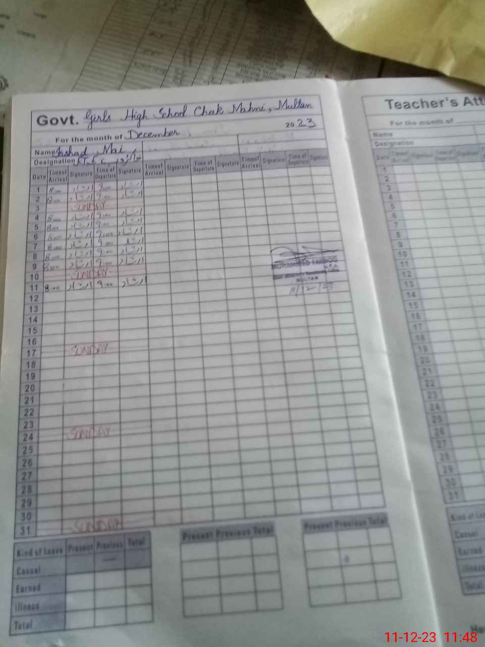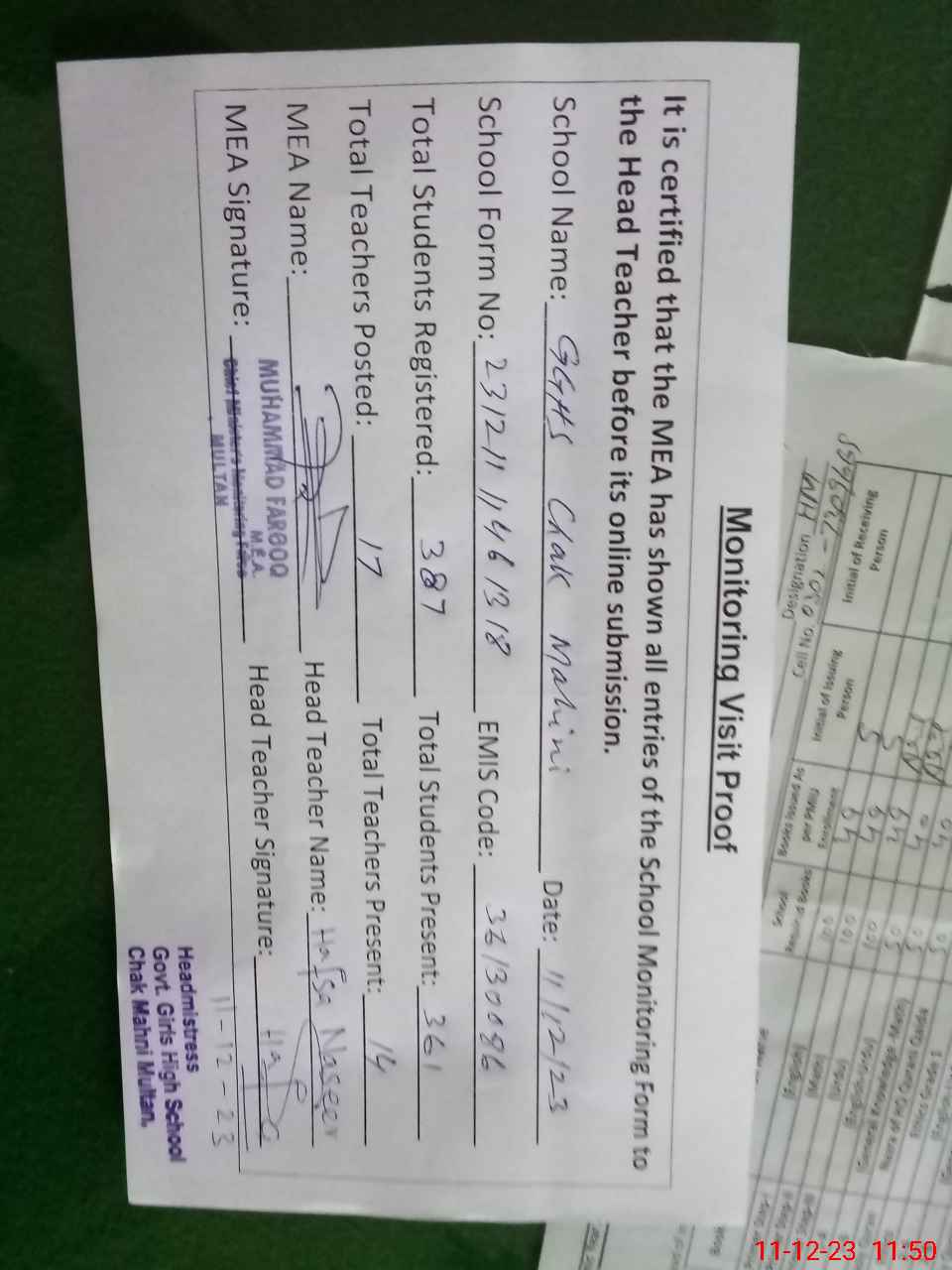 | Attendance Register | Head Teacher | MEA with School | Visit Proof |