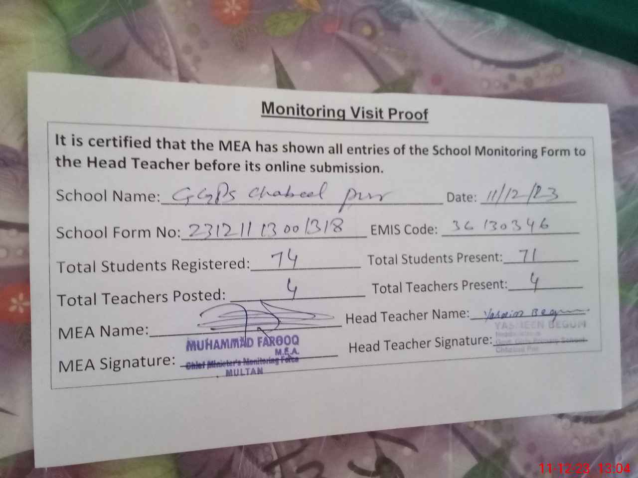 | Attendance Register | Head Teacher | MEA with School | Visit Proof |