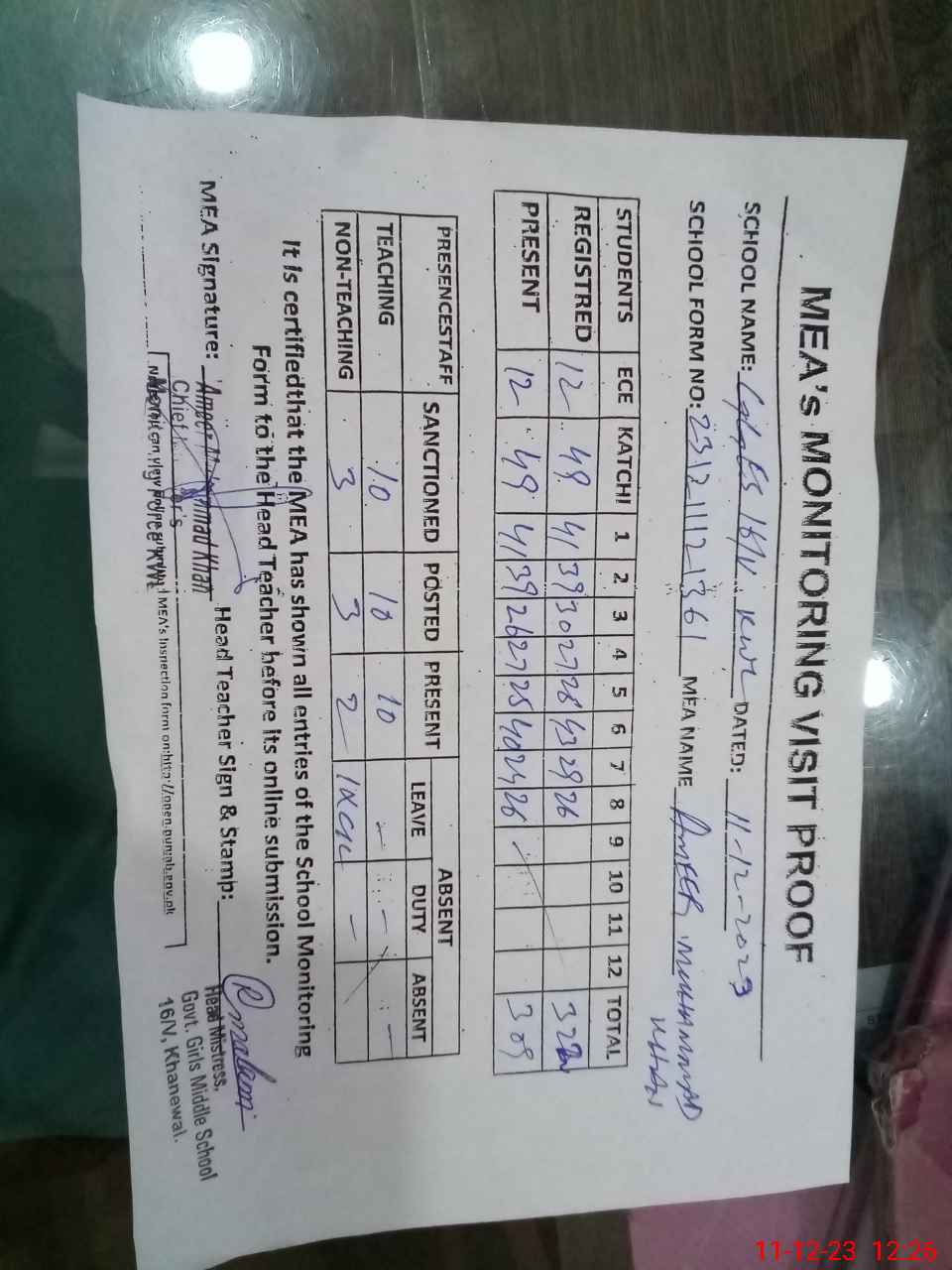 | Attendance Register | Head Teacher | MEA with School | Visit Proof |