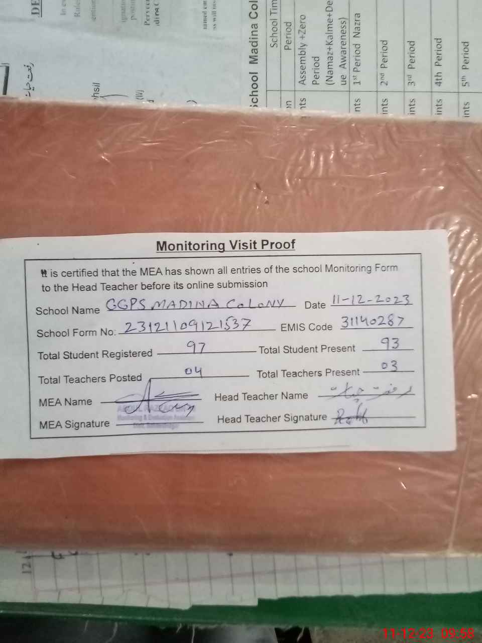 | Attendance Register | Head Teacher | MEA with School | Visit Proof |