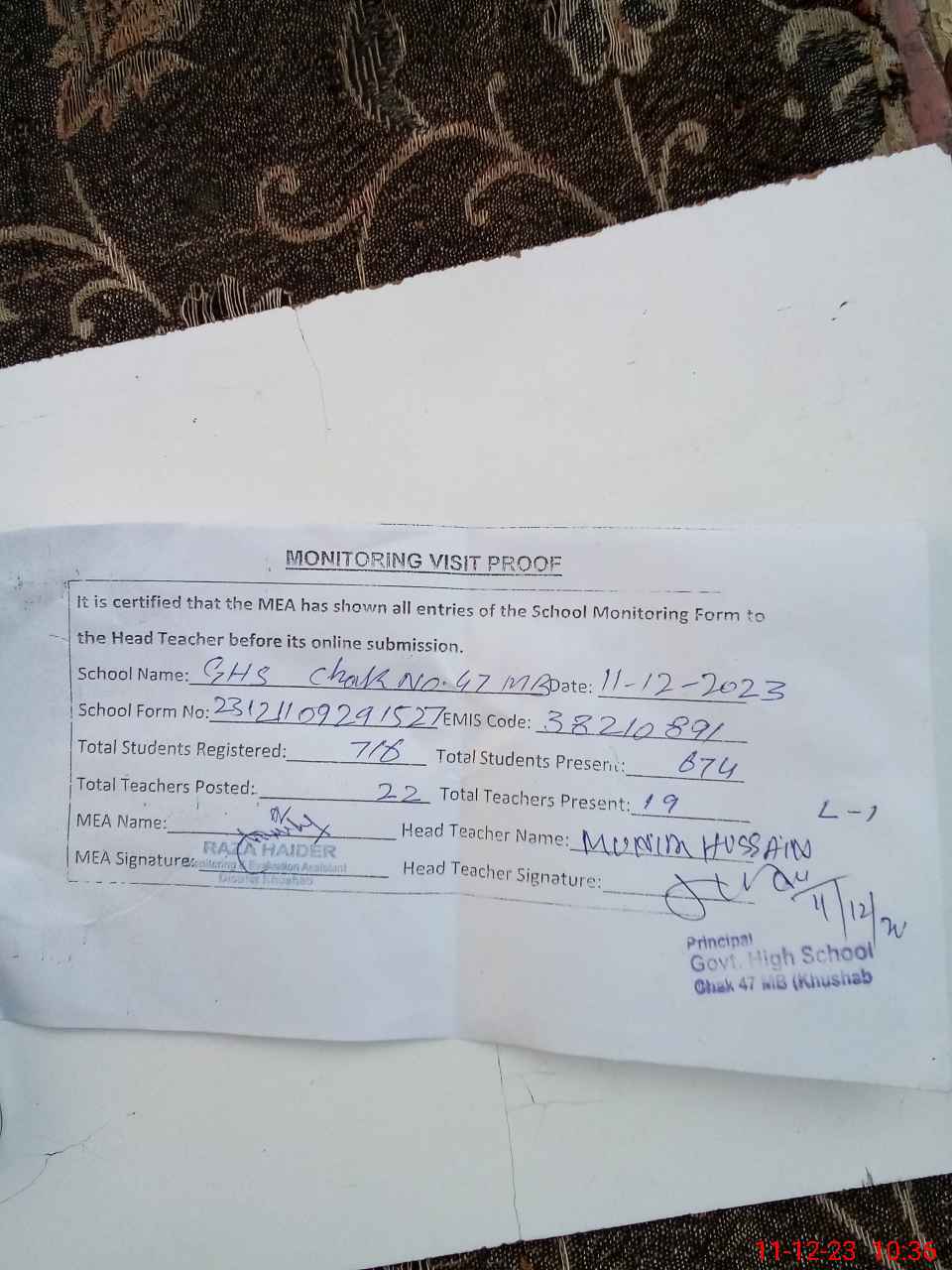 | Monitoring Date: 11-12-2023 | Start Time: 11-12-2023 09:26 AM | End Time: 11-12-2023 10:37 AM | Name of MEA: RA**** HA**** | |