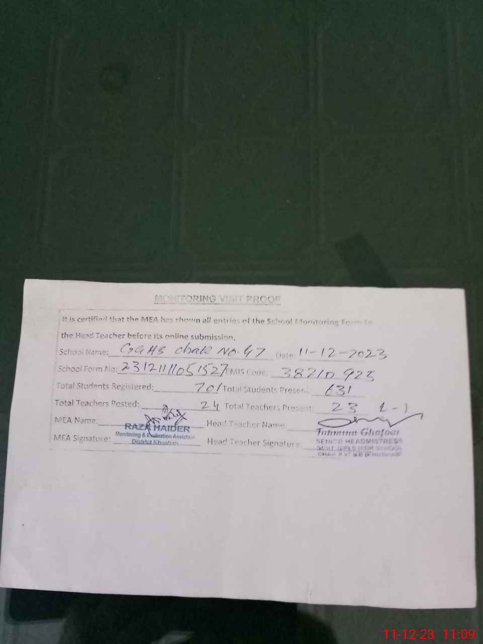 | Attendance Register | Head Teacher | MEA with School | Visit Proof |