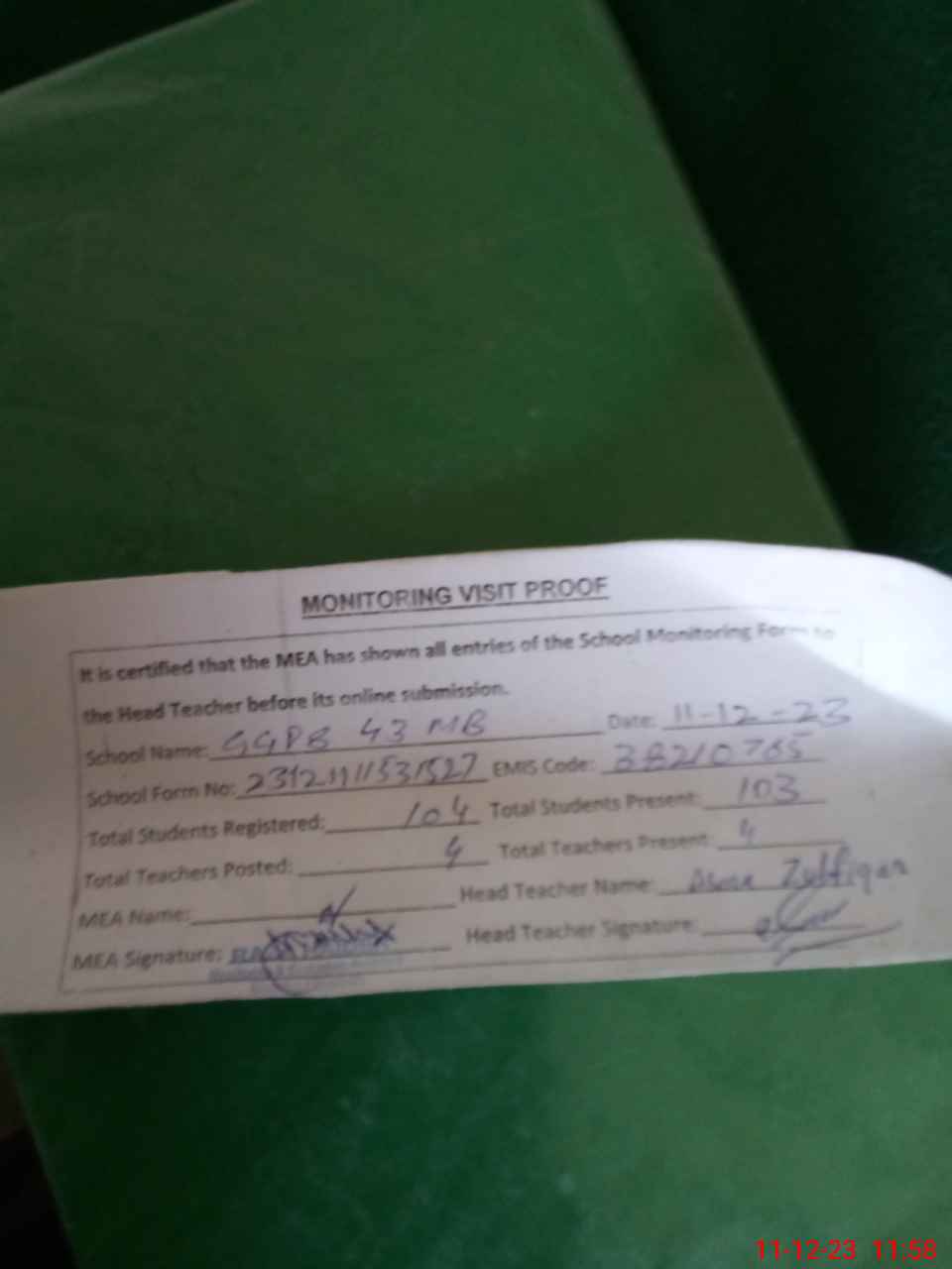 | EMIS Code: 38210765 | Name of School: GGPS CHAK NO 43 MB | |||
