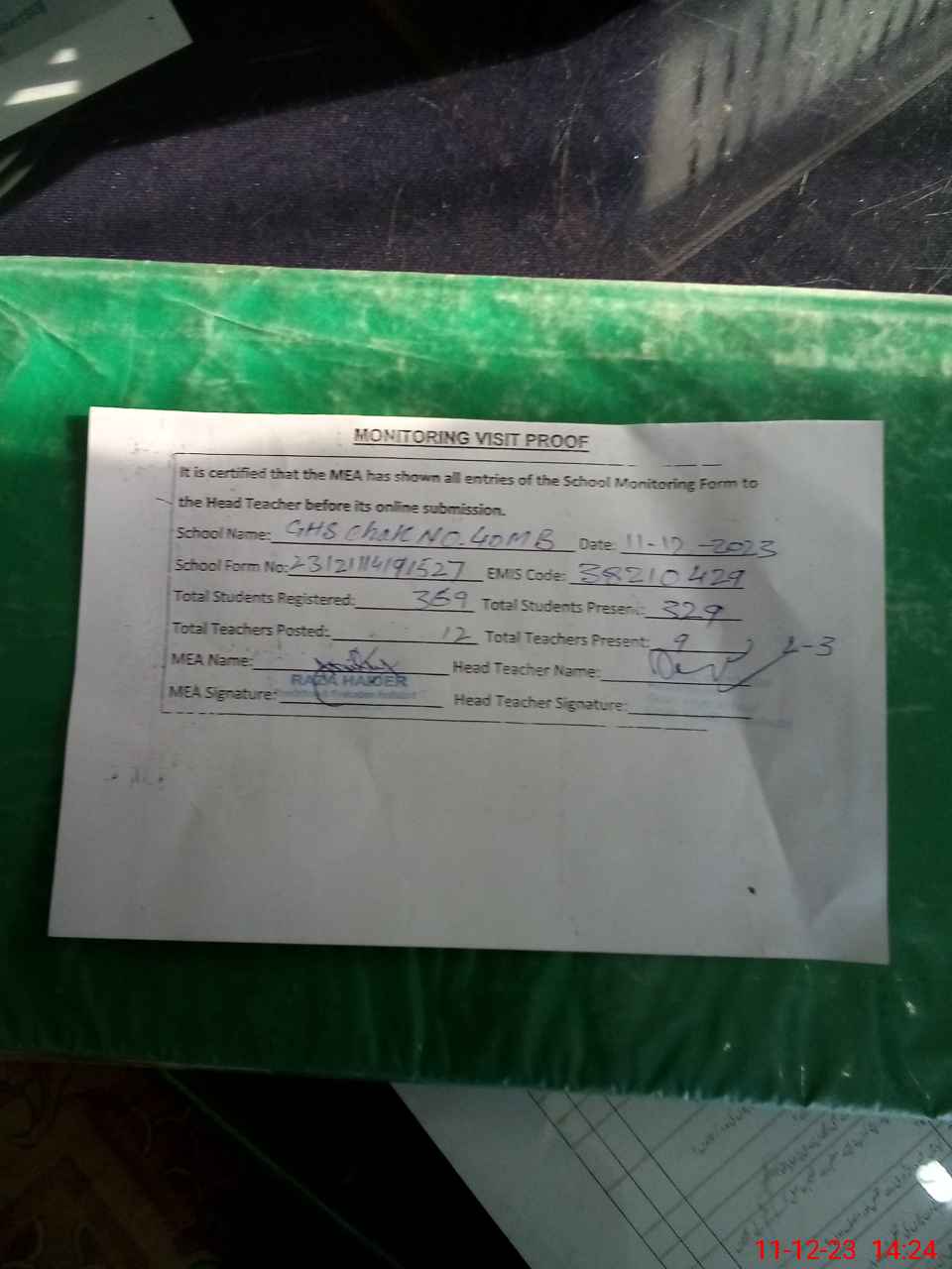 | Attendance Register | Head Teacher | MEA with School | Visit Proof |