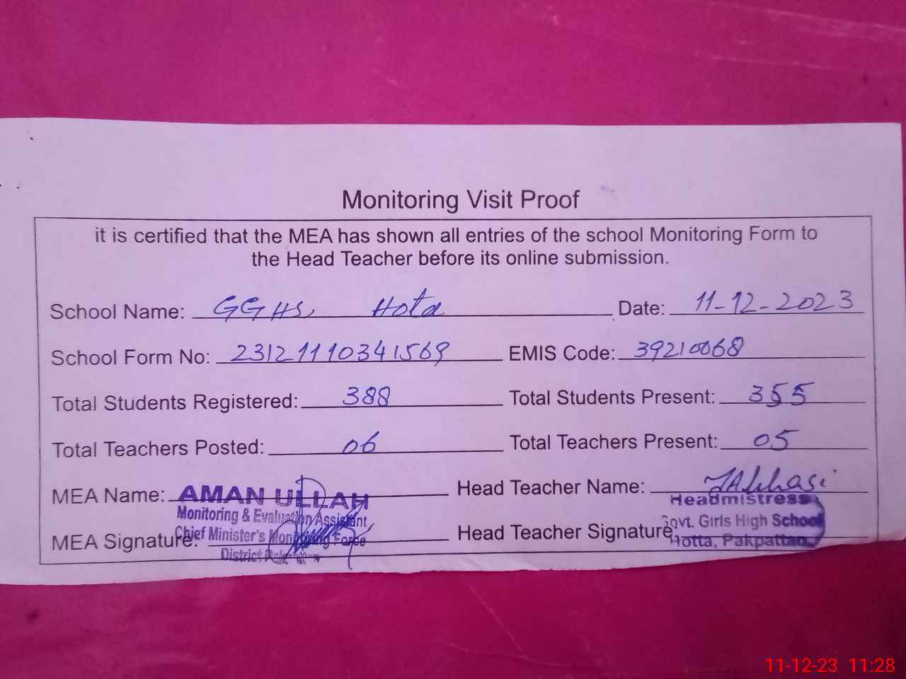 | Attendance Register | Head Teacher | MEA with School | Visit Proof |