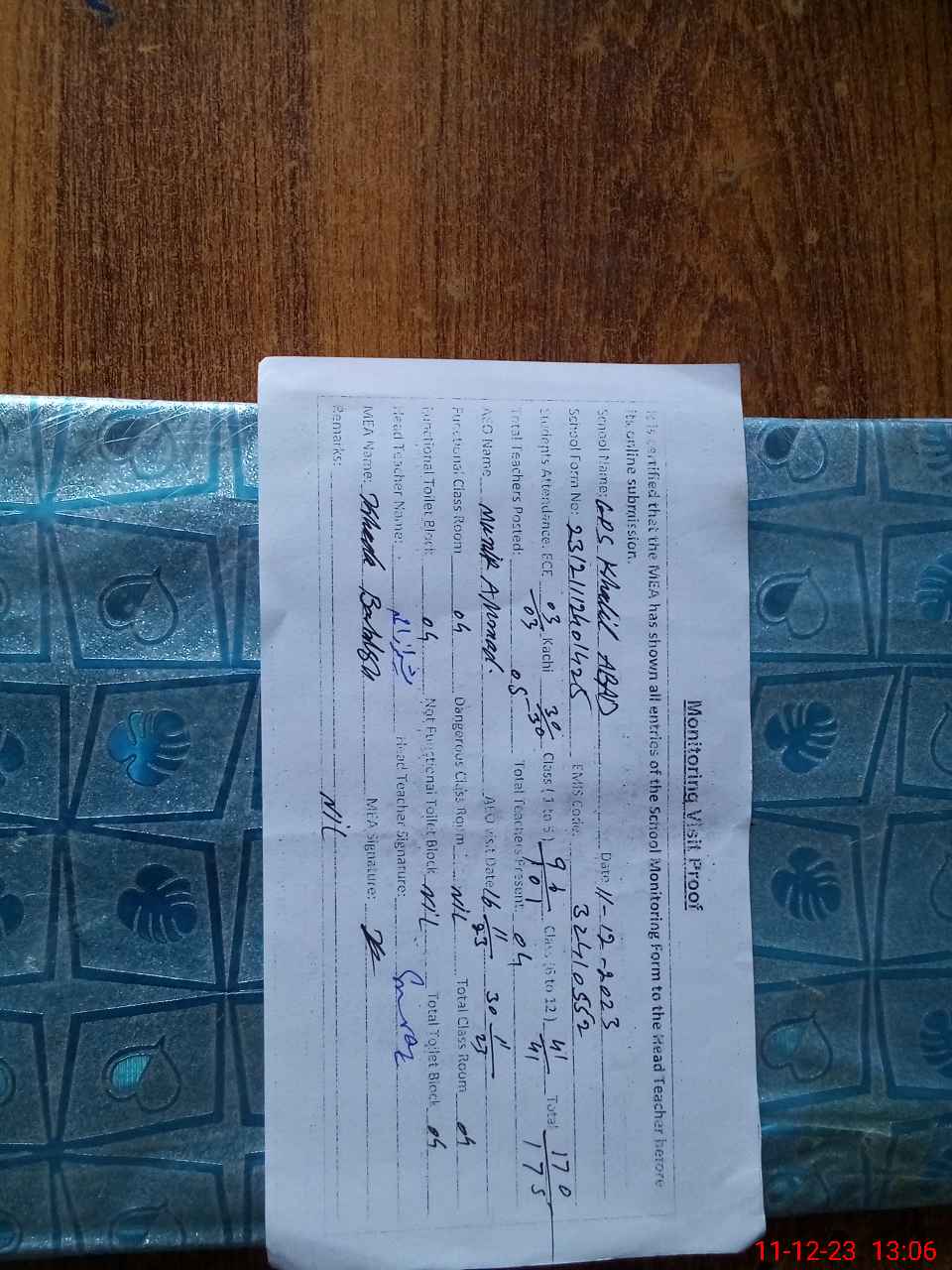 | Monitoring Date: 11-12-2023 | Start Time: 11-12-2023 12:40 PM | End Time: 11-12-2023 01:07 PM | Name of MEA: Kh**** Ba**** | |