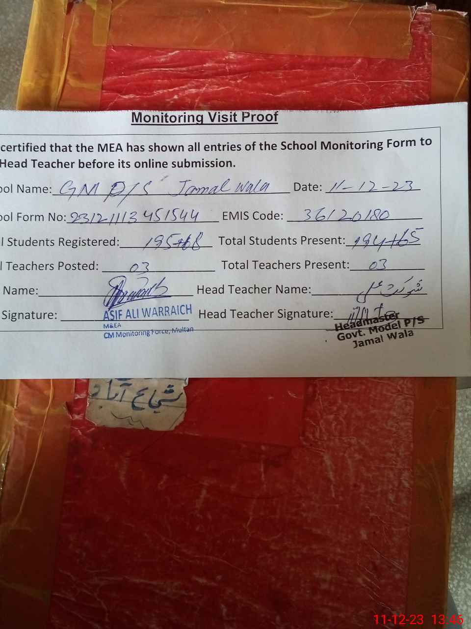 | EMIS Code: 36120180 | Name of School: GMPS JAMAL WALA SHUJABAD | |||