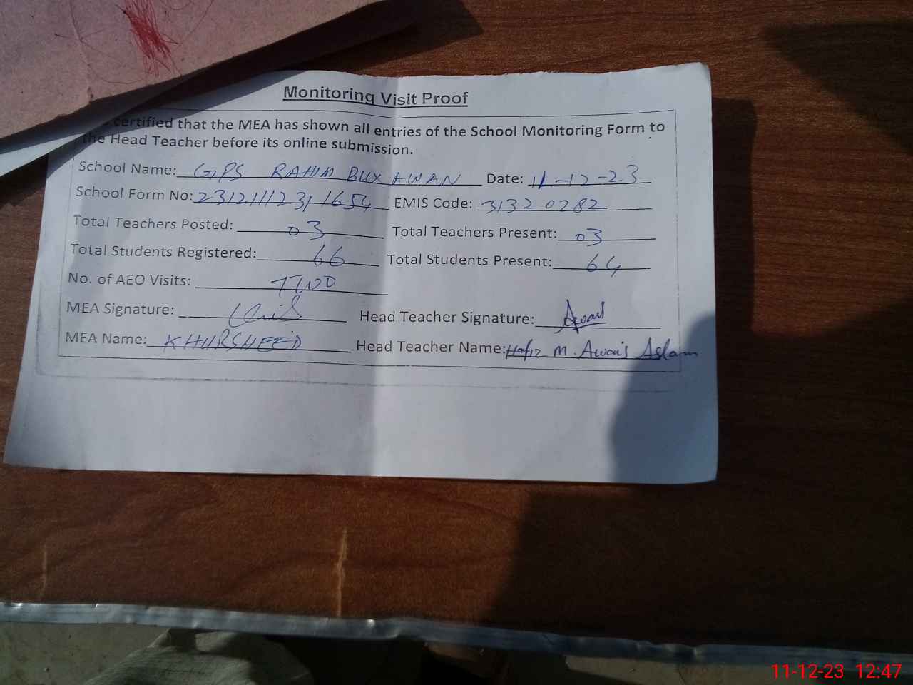 | Attendance Register | Head Teacher | MEA with School | Visit Proof |
