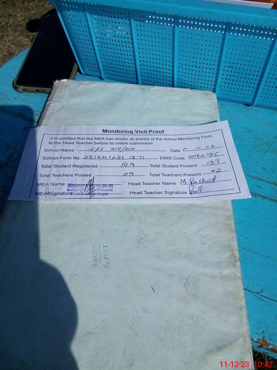 | Attendance Register | Head Teacher | MEA with School | Visit Proof |