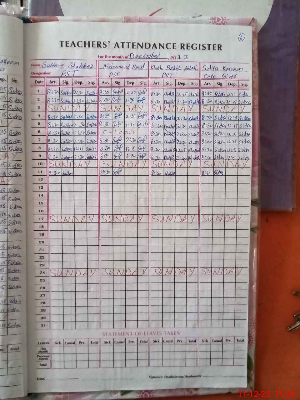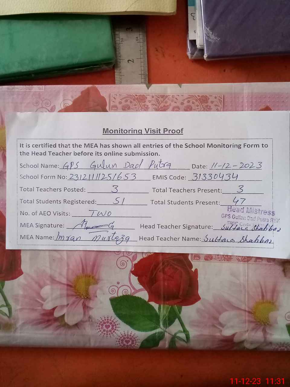 | Attendance Register | Head Teacher | MEA with School | Visit Proof |