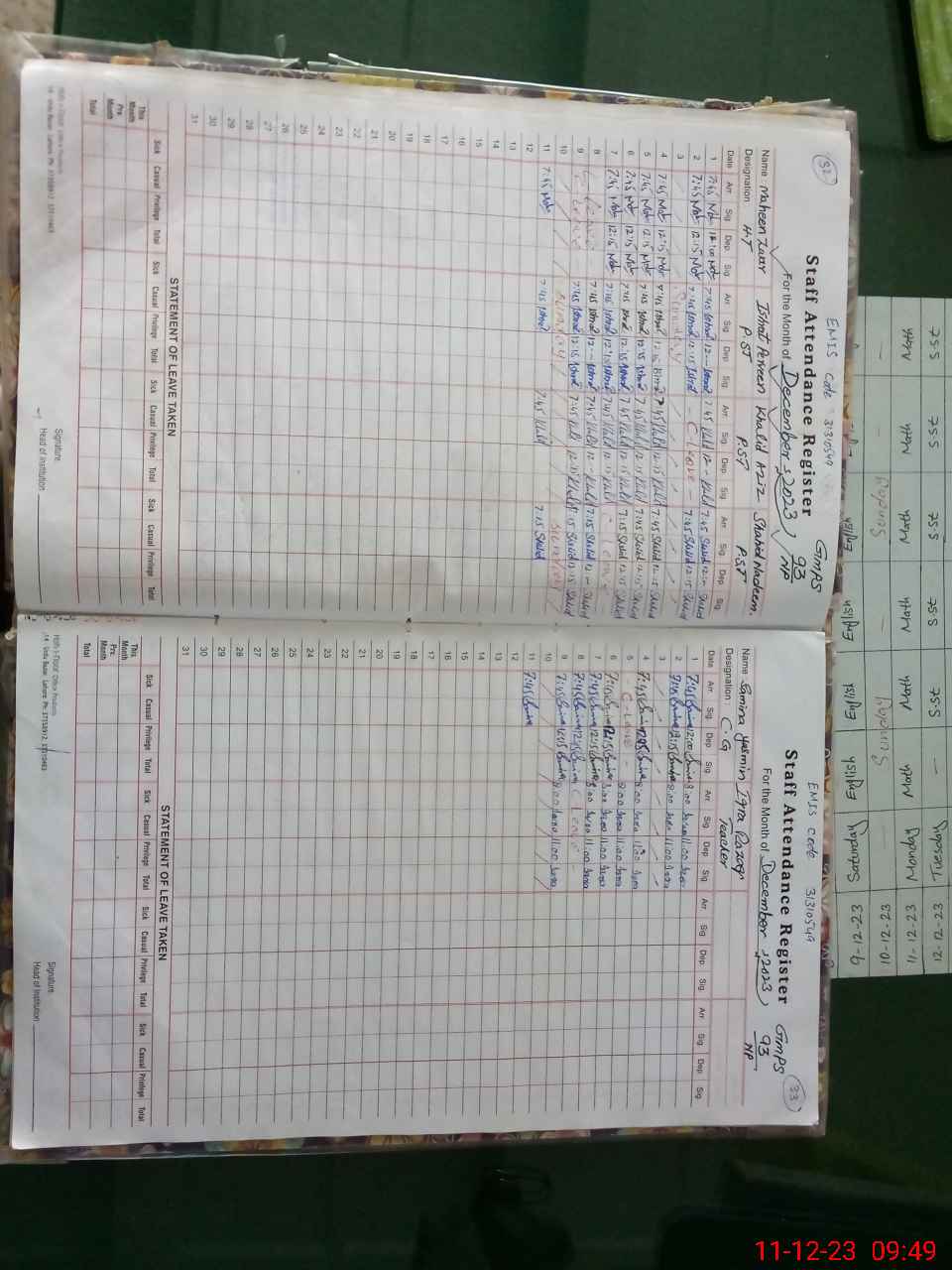 | Monitoring Date: 11-12-2023 | Start Time: 11-12-2023 09:19 AM | End Time: 11-12-2023 09:54 AM | Name of MEA: Ab**** Qa**** | |