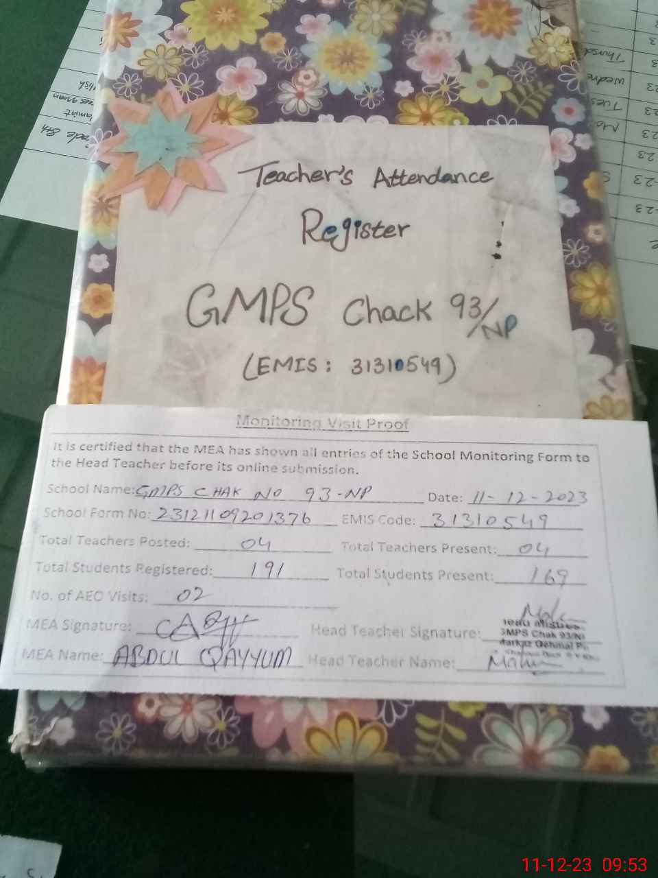 | Attendance Register | Head Teacher | MEA with School | Visit Proof |