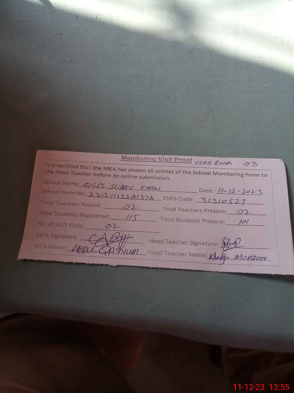 | Monitoring Date: 11-12-2023 | Start Time: 11-12-2023 01:28 PM | End Time: 11-12-2023 01:55 PM | Name of MEA: Ab**** Qa**** | |