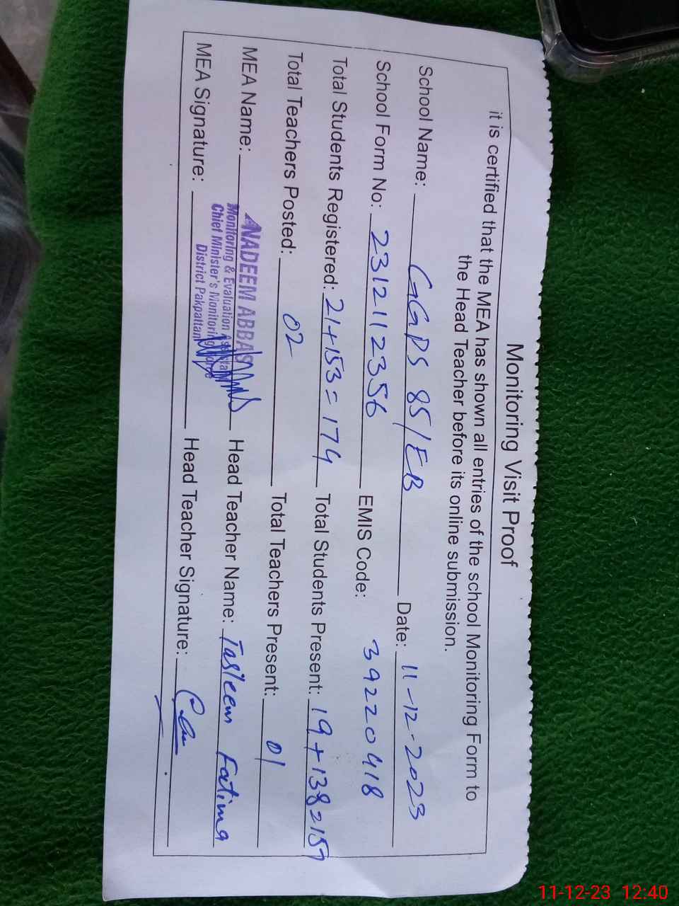 | EMIS Code: 39220418 | Name of School: GGPS 85 EB POST OFFICE QABOOLA | |||