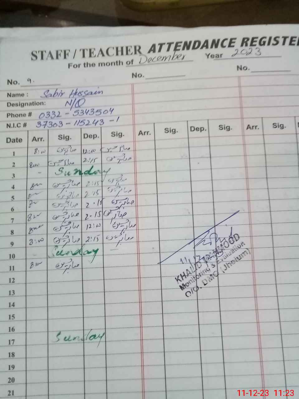| CNIC | Full Name | Designation | R/C | Absence During Last Calender Month |