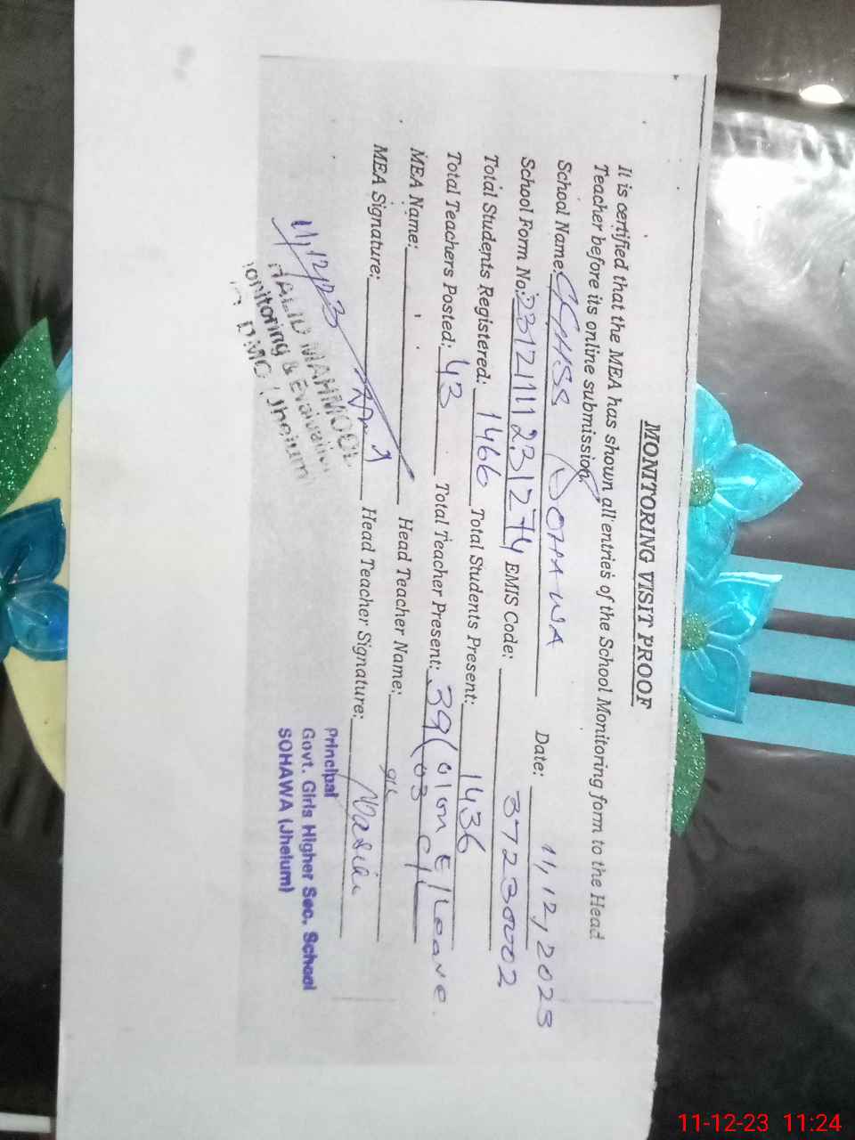 | Attendance Register | Head Teacher | MEA with School | Visit Proof |