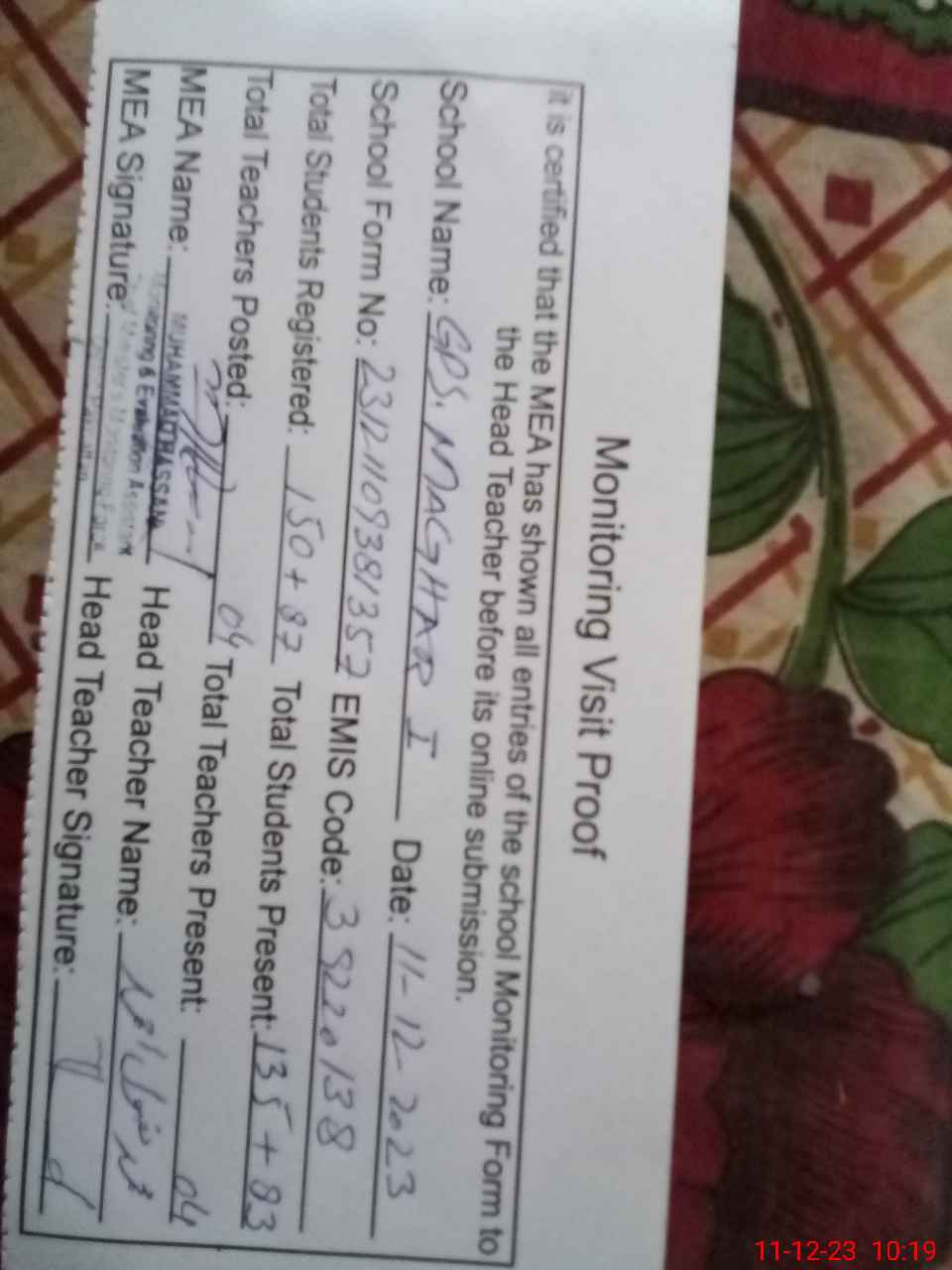 | EMIS Code: 39220138 | Name of School: GPS MAGHER NO. 1 | |||