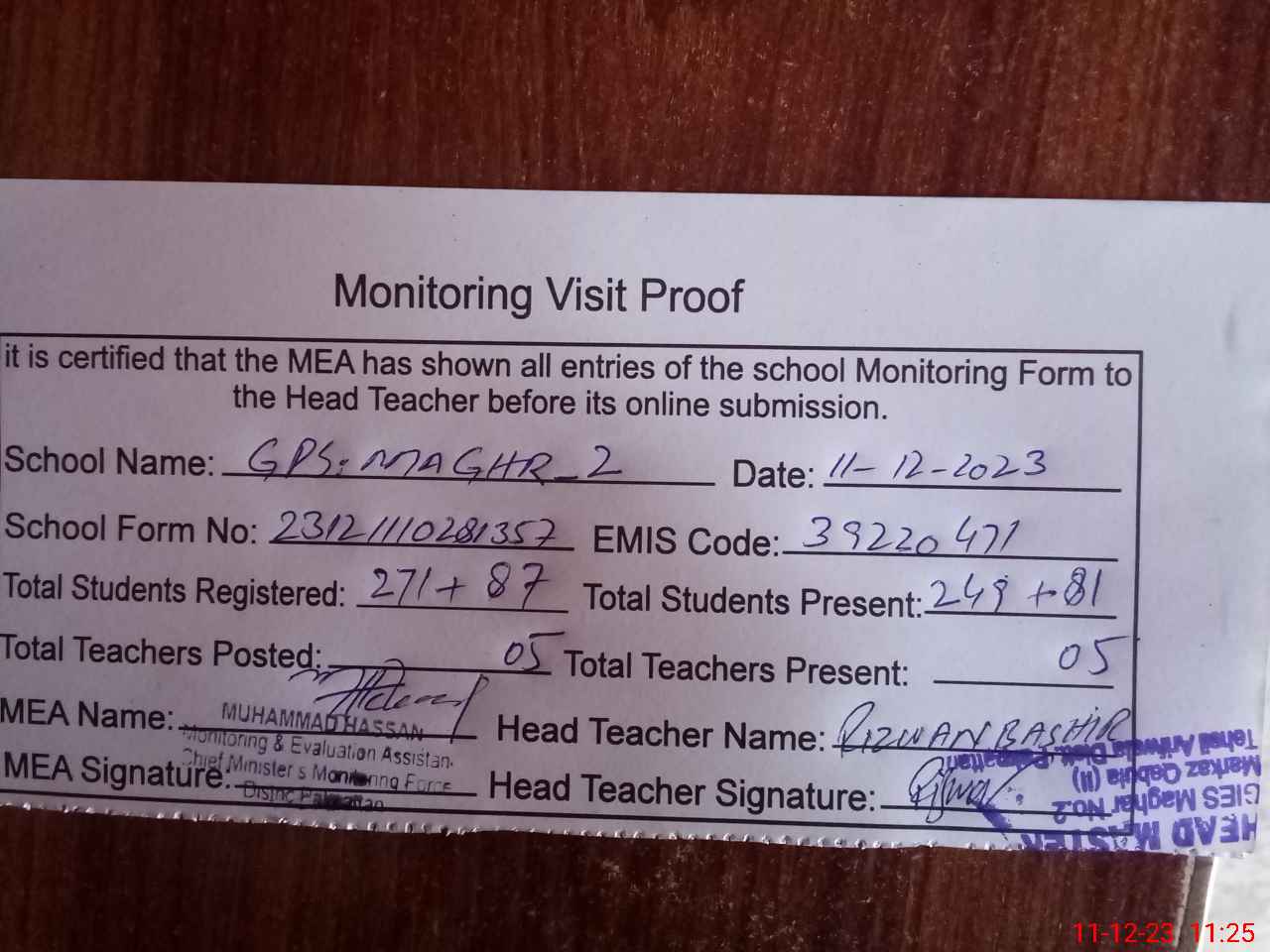 | Attendance Register | Head Teacher | MEA with School | Visit Proof |