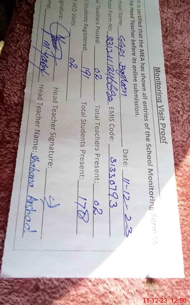 | Attendance Register | Head Teacher | MEA with School | Visit Proof |