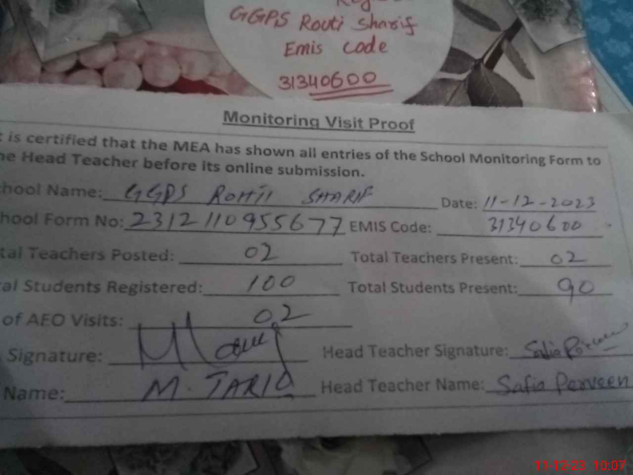 | Attendance Register | Head Teacher | MEA with School | Visit Proof |