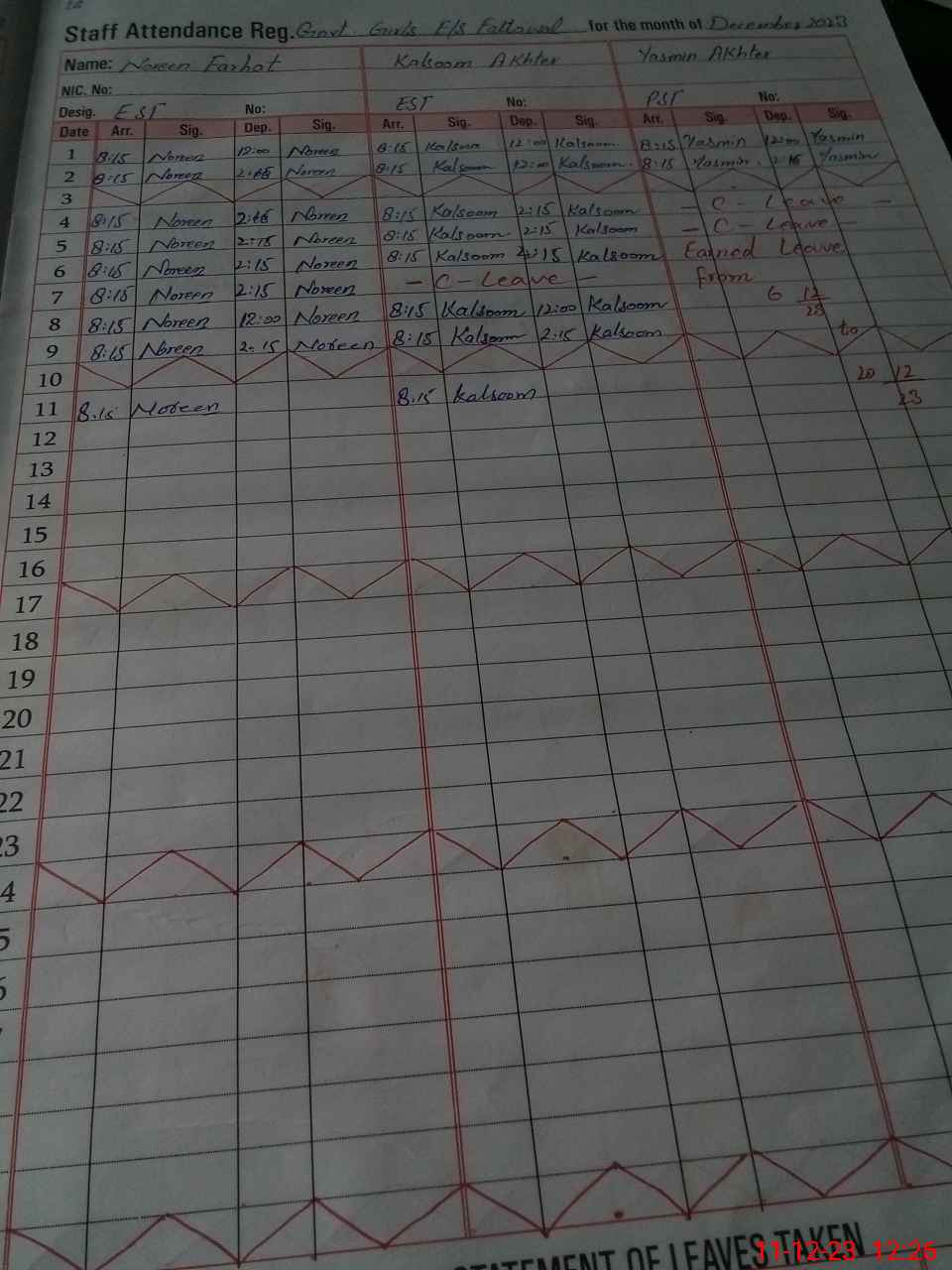 | CNIC | Full Name | Designation | R/C | Absence During Last Calender Month |