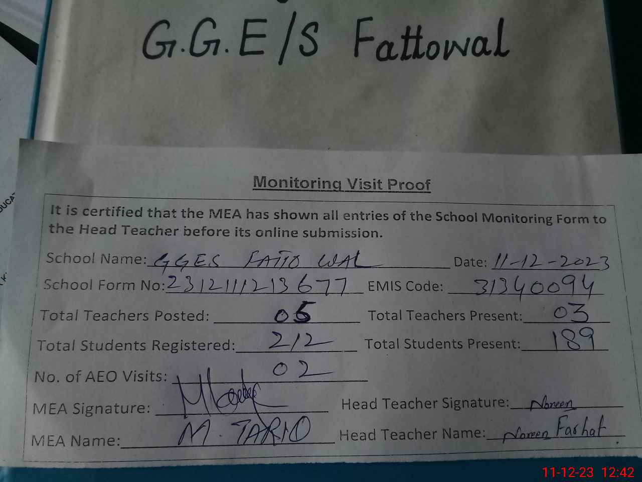 | Attendance Register | Head Teacher | MEA with School | Visit Proof |