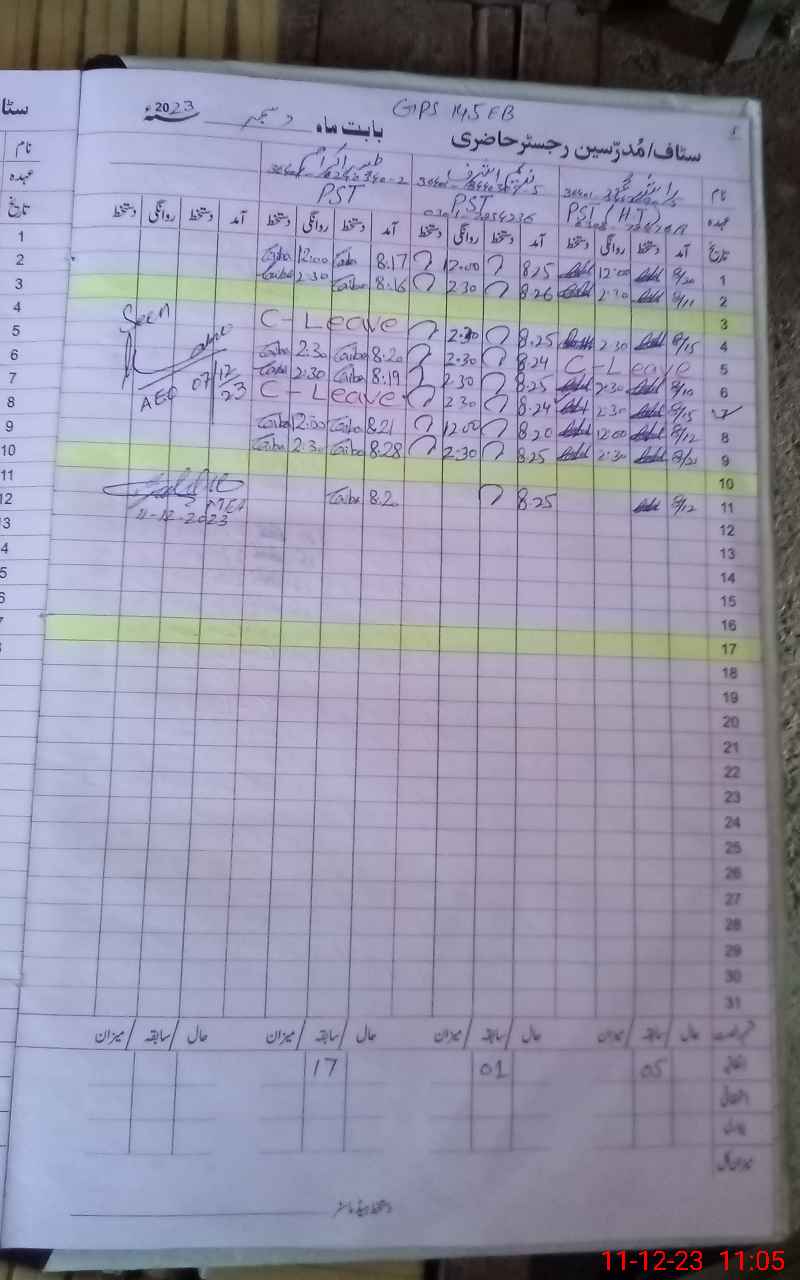 | CNIC | Full Name | Designation | R/C | Absence During Last Calender Month |