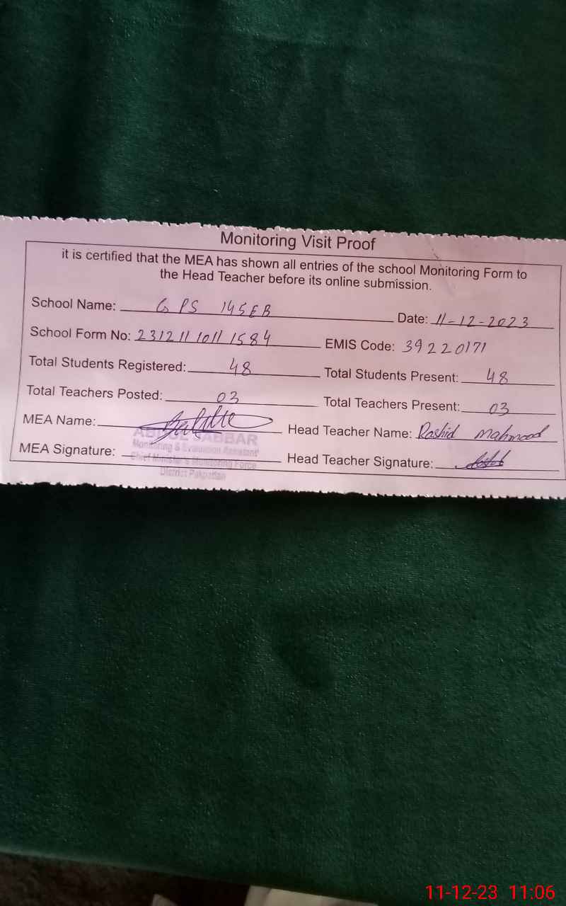 | Monitoring Date: 11-12-2023 | Start Time: 11-12-2023 10:11 AM | End Time: 11-12-2023 11:06 AM | Name of MEA: AB**** JA**** | |