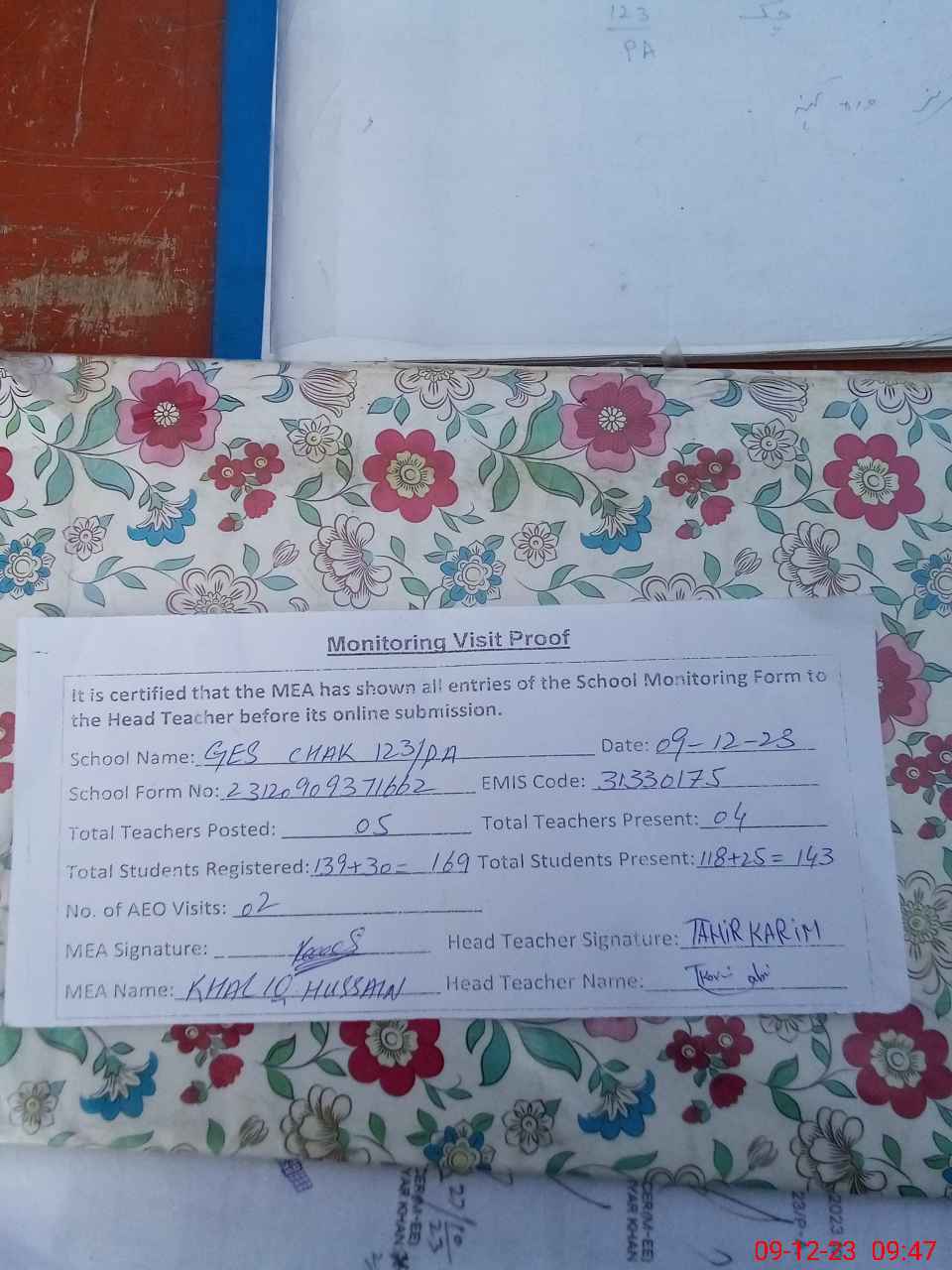 | EMIS Code: 31330175 | Name of School: GPS CHAK NO.123/P-A | |||