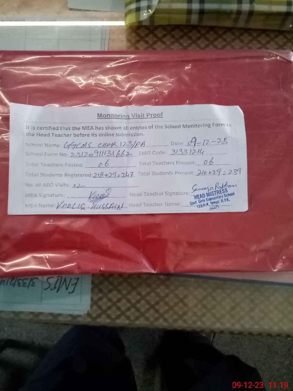 | Attendance Register | Head Teacher | MEA with School | Visit Proof |