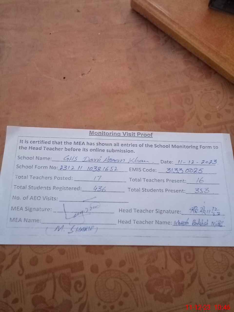 | Attendance Register | Head Teacher | MEA with School | Visit Proof |
