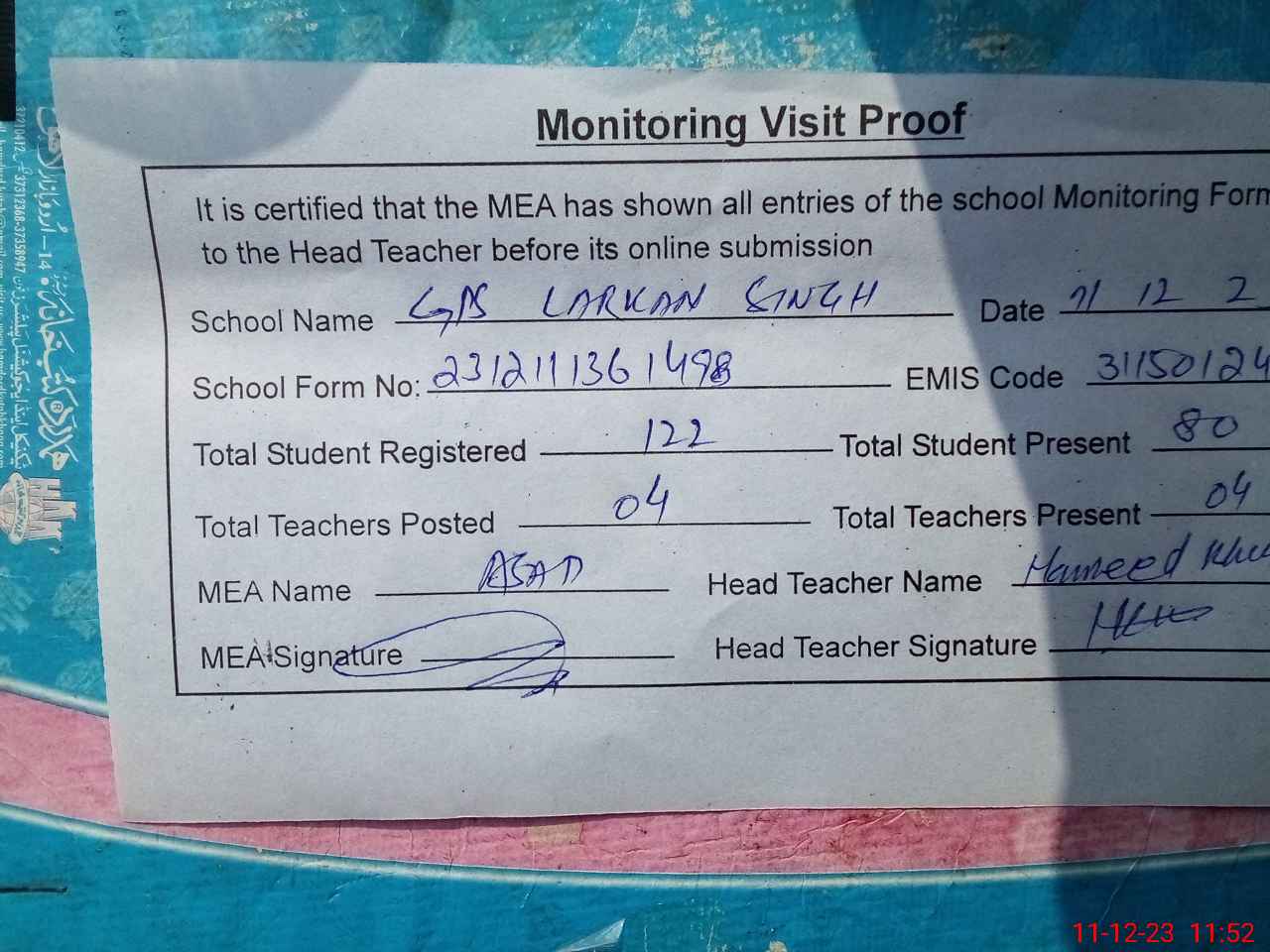 | EMIS Code: 31150124 | Name of School: GPS LARKAHAN SINGH | |||