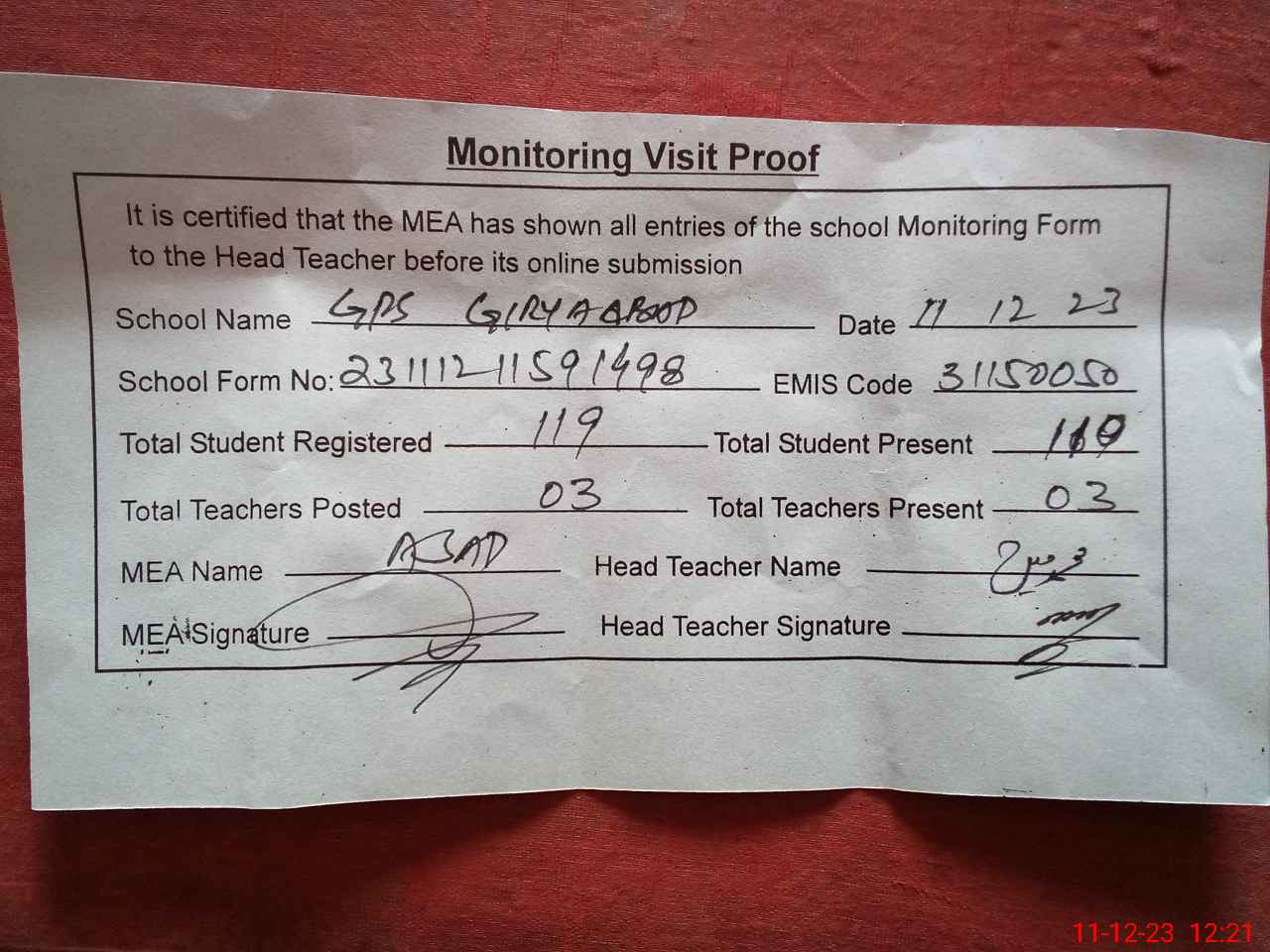 | Attendance Register | Head Teacher | MEA with School | Visit Proof |
