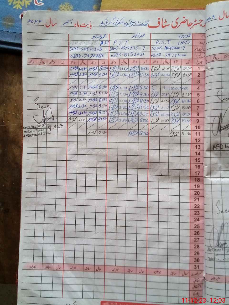 | CNIC | Full Name | Designation | R/C | Absence during last cal. month |