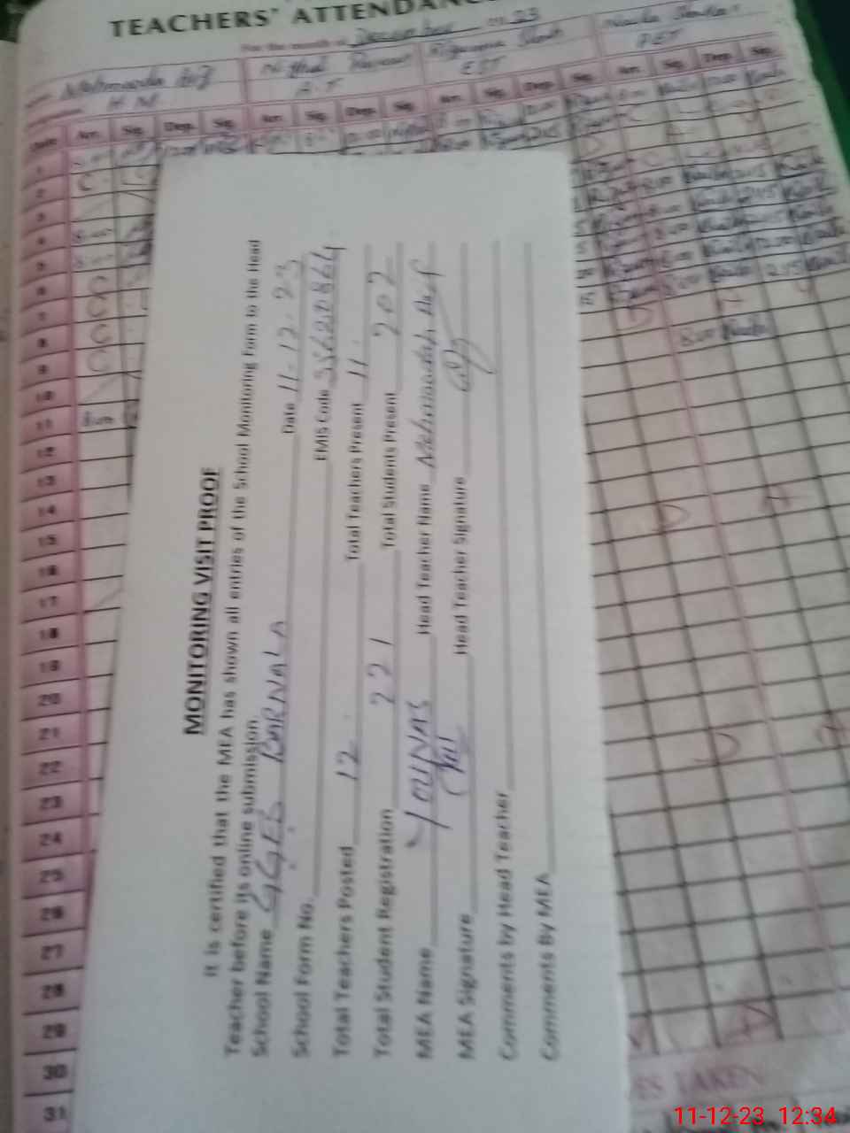| Attendance Register | Head Teacher | MEA with School | Visit Proof |